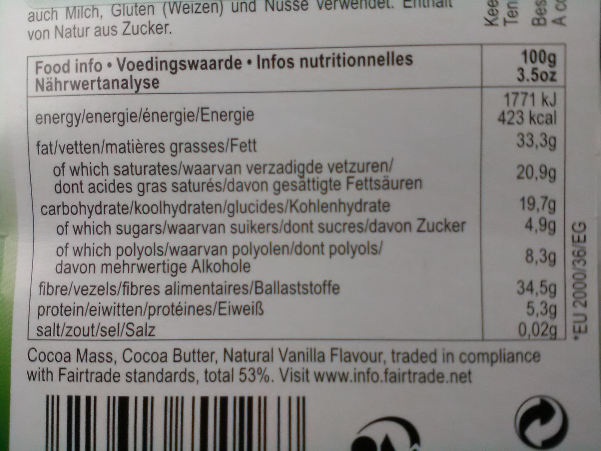 Toode sisaldab keskmiselt 100 grammis 1 viilus (31 g) Energia 916 kJ / 218 kcal 284 kJ / 68 kcal Rasvad 6,4 g 2,0 g – millest küllastunud rasvhapped 0,7 g 0,2 g Süsivesikud 24,6 g 7,6 g – millest suhkrud 0,6 g 0,2 g Kiudained 10,6 g 3,3 g – millest beetaglükaane 3,0 μg 1,0 μg Valgud 3,0 g 1,0 g Sool 1,2 g 0,4 g Nony