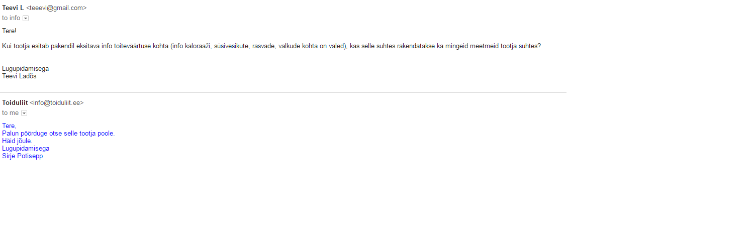 Kusjuures Helenaga mõni aeg tagasi arutasime seda teemat, mispeale ma kirjutasin Toiduliitu, kust sain sellise vastuse (vt pilt). Eile kirjutasin Veterinaar- ja Toiduametisse, aga sealt pole veel vastust saanud. Ju siis tuleb järgmisena tarbijakaitseamet ette võtta.
