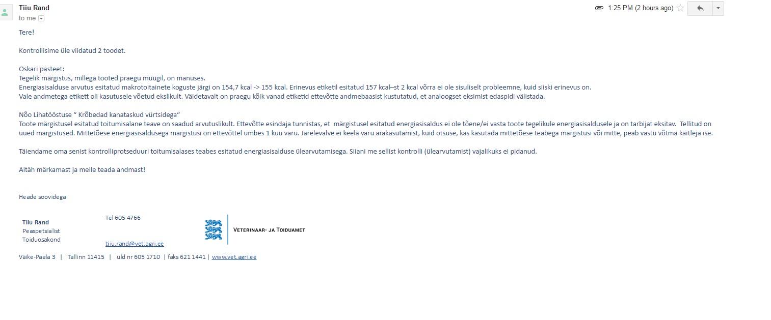MemberOn 1/26/2017 at 0:02 PM, teevi said:Kusjuures Helenaga mõni aeg tagasi arutasime seda teemat, mispeale ma kirjutasin Toiduliitu, kust sain sellise vastuse (vt pilt). Eile kirjutasin Veterinaar- ja Toiduametisse, aga sealt pole veel vastust saanud. Ju siis tuleb järgmisena tarbijakaitseamet ette võtta.
