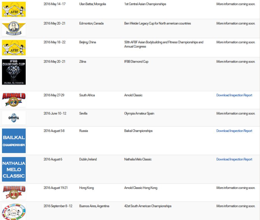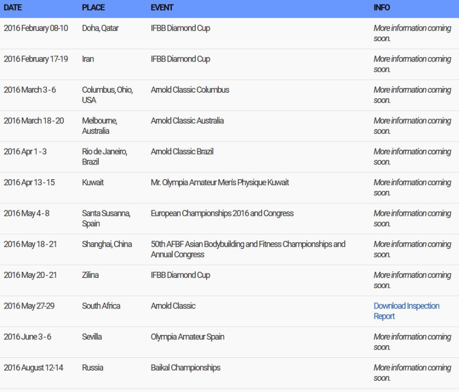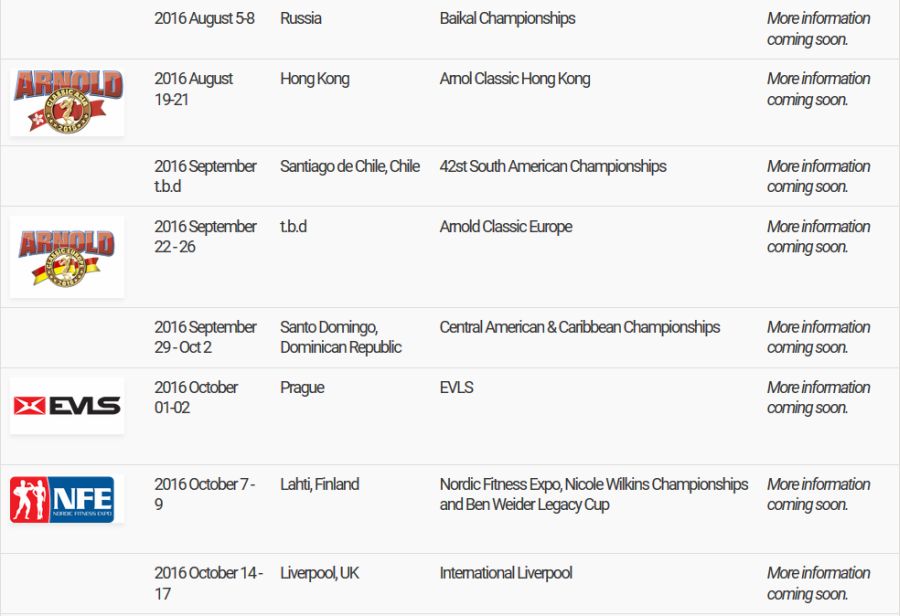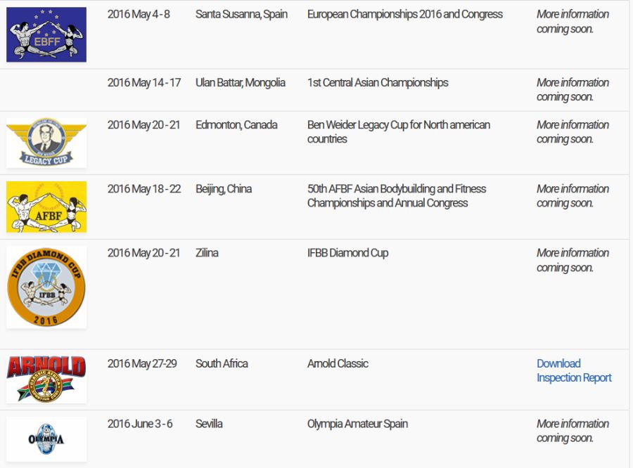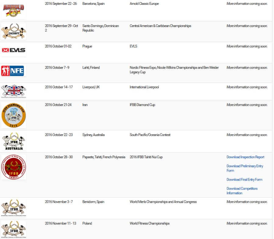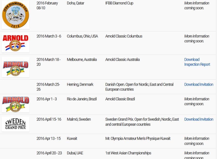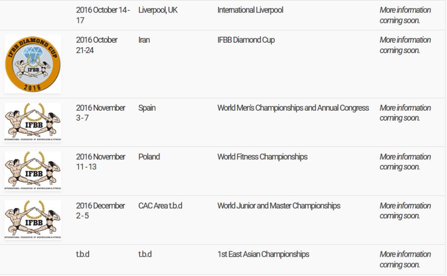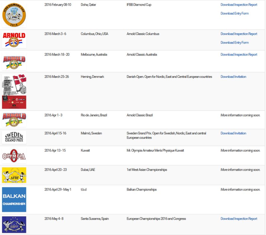 2016 IFBB contest calendar has been released and one can find it at http://www.ifbb.com/ifbb-board/. Calendar is not complete and will be updated later on.