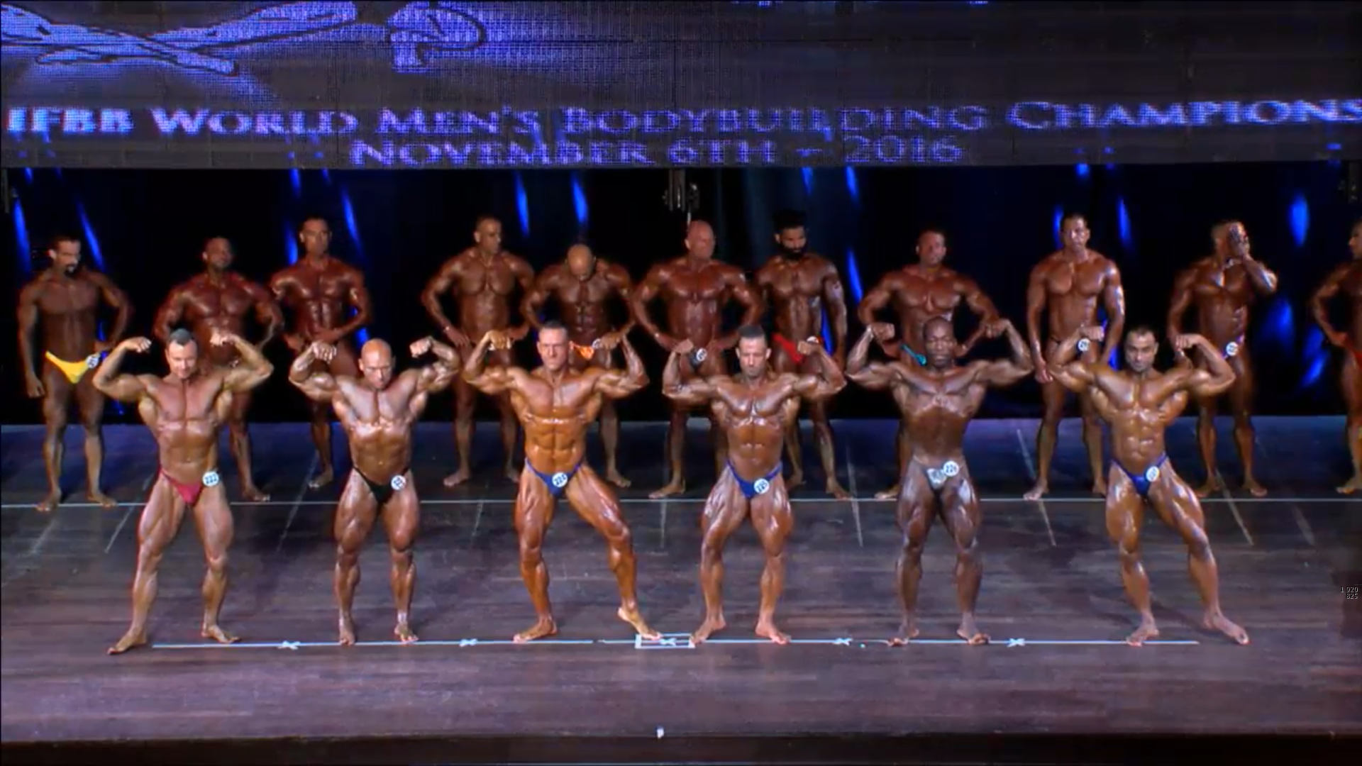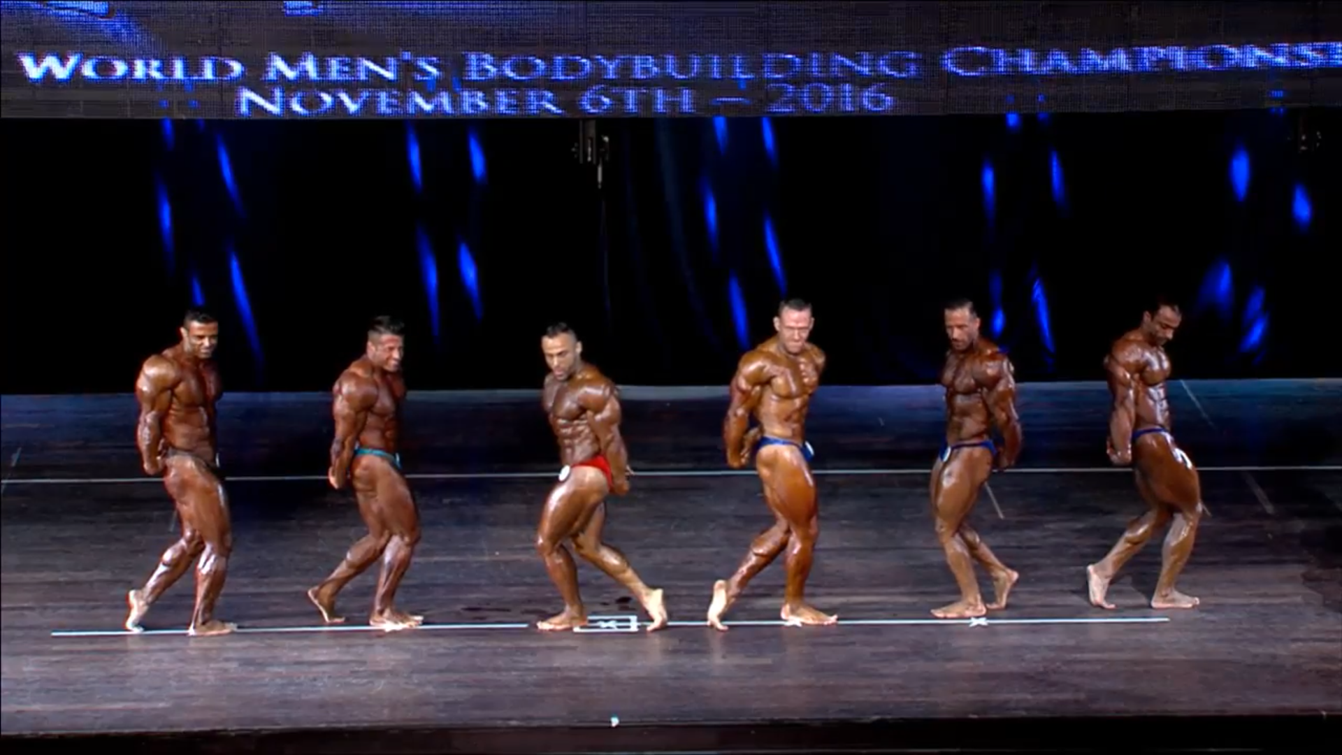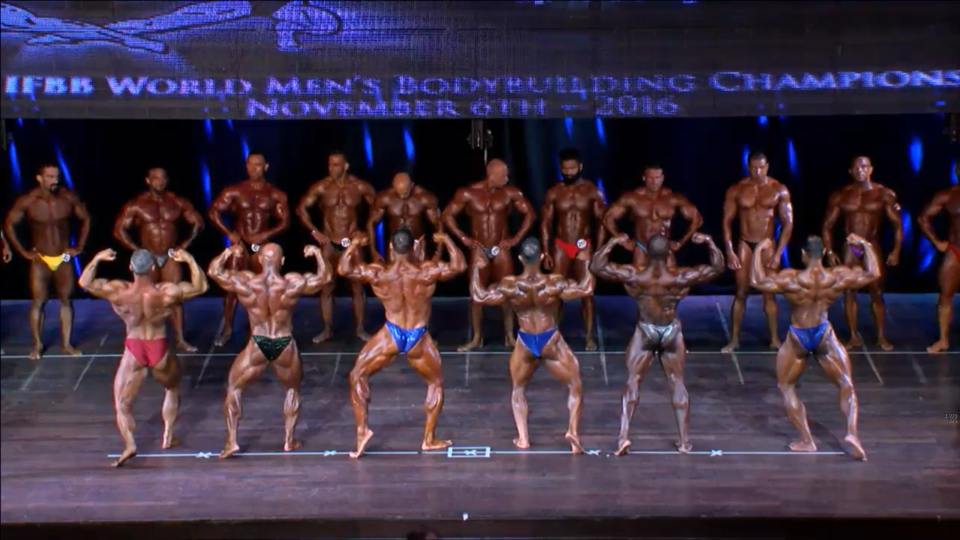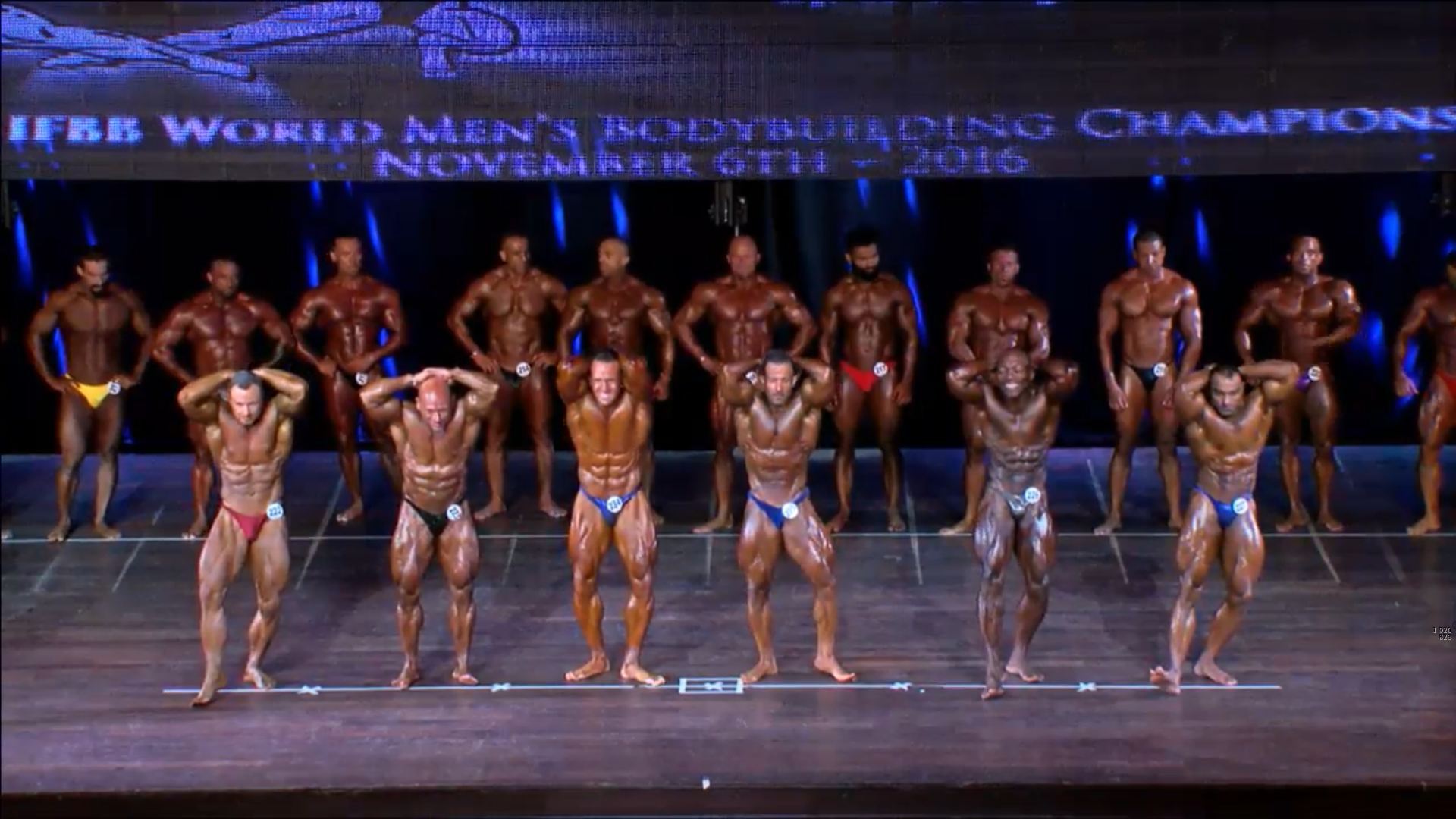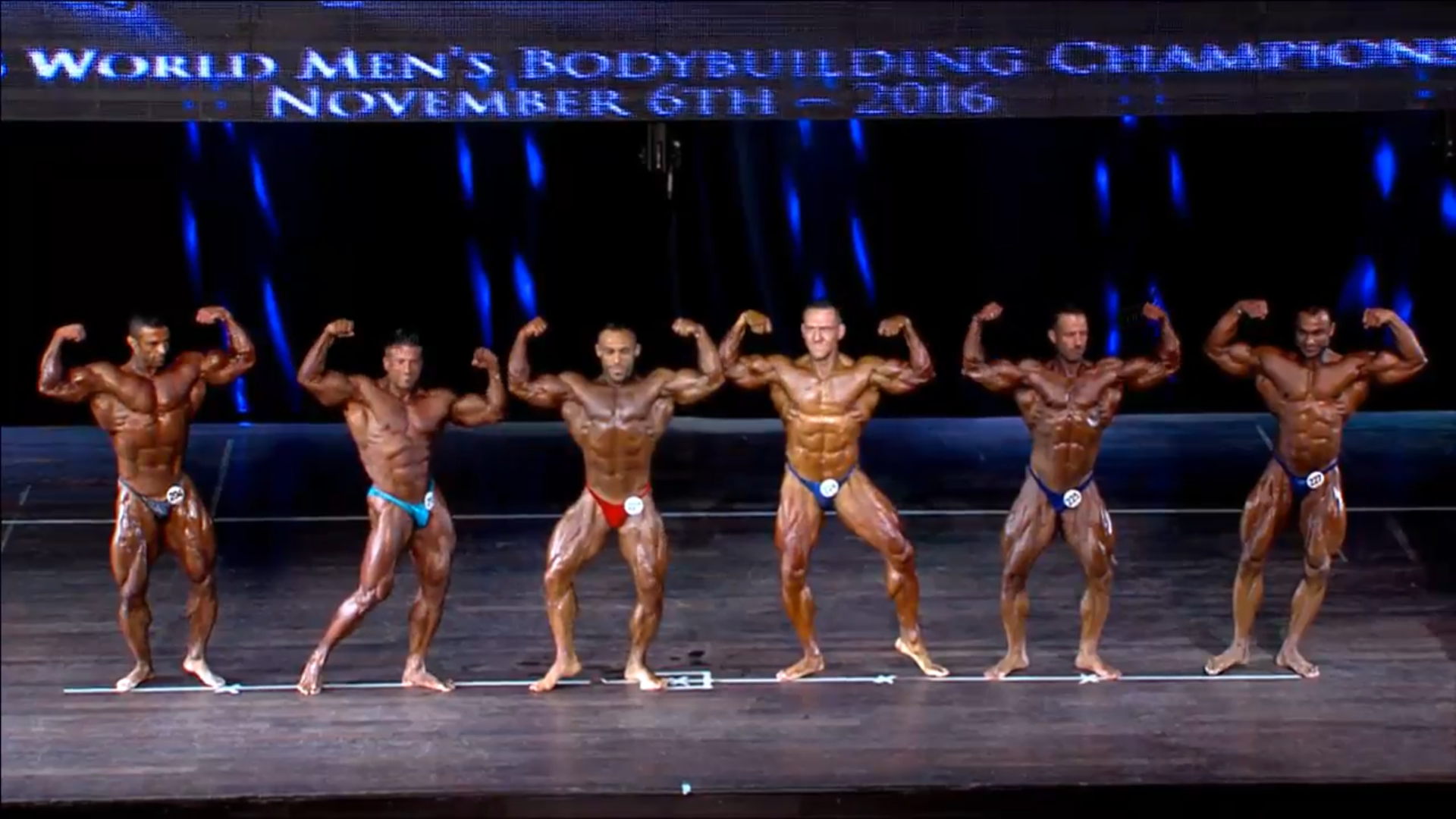 (4 Compulsory Poses in groups of 5) > List of the Semifinalists backstage2. Men Bodybuilding up to 80 kg Elimination Round (if >15)