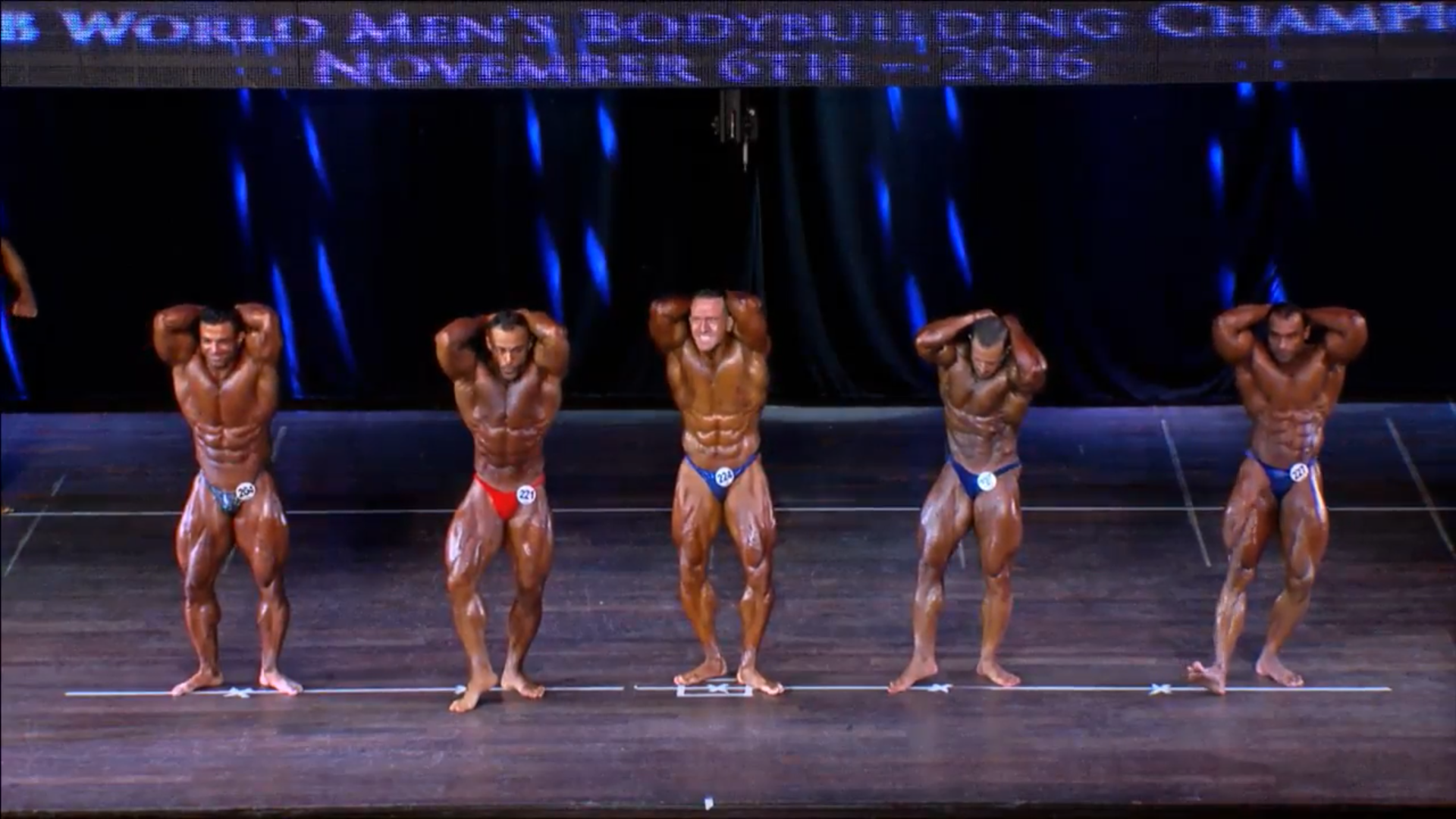 (4 Compulsory Poses in groups of 5) > List of the Semifinalists backstage4. Men Bodybuilding up to 90 kg Elimination Round (if >15)