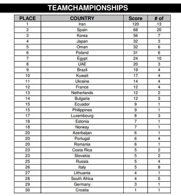 Riikide arvestuses samuti esikoht Iraanile. Kokku 5 kategooria võitu.