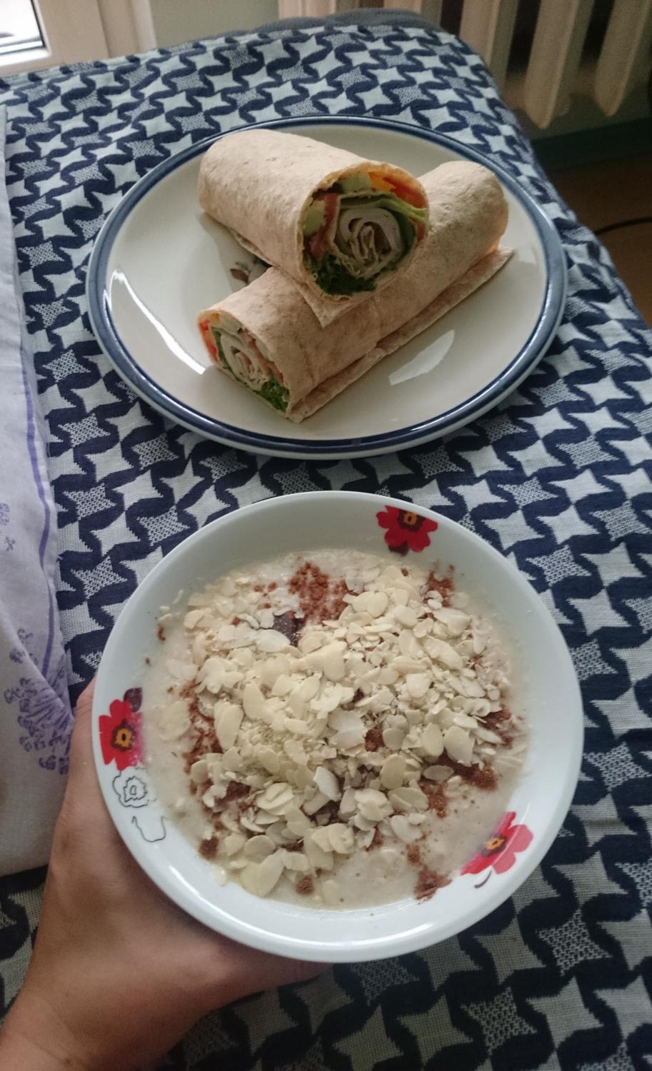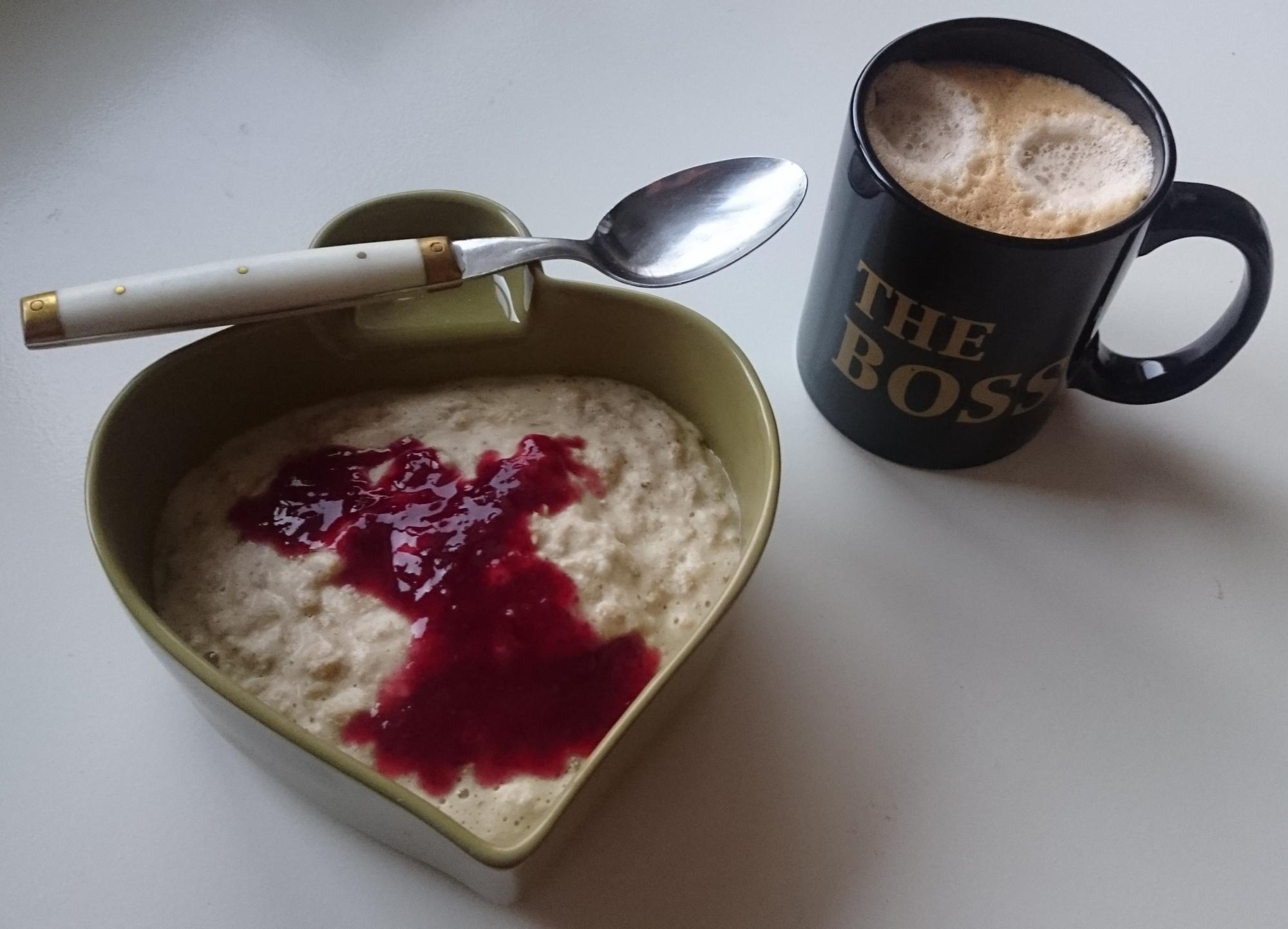 Puder mulle, täisteralavaširullid noormehele <--- ja ---> kodus Hiiumaal mõnus puder vaarikamoosiga, kõrval must kohv (bossasin)