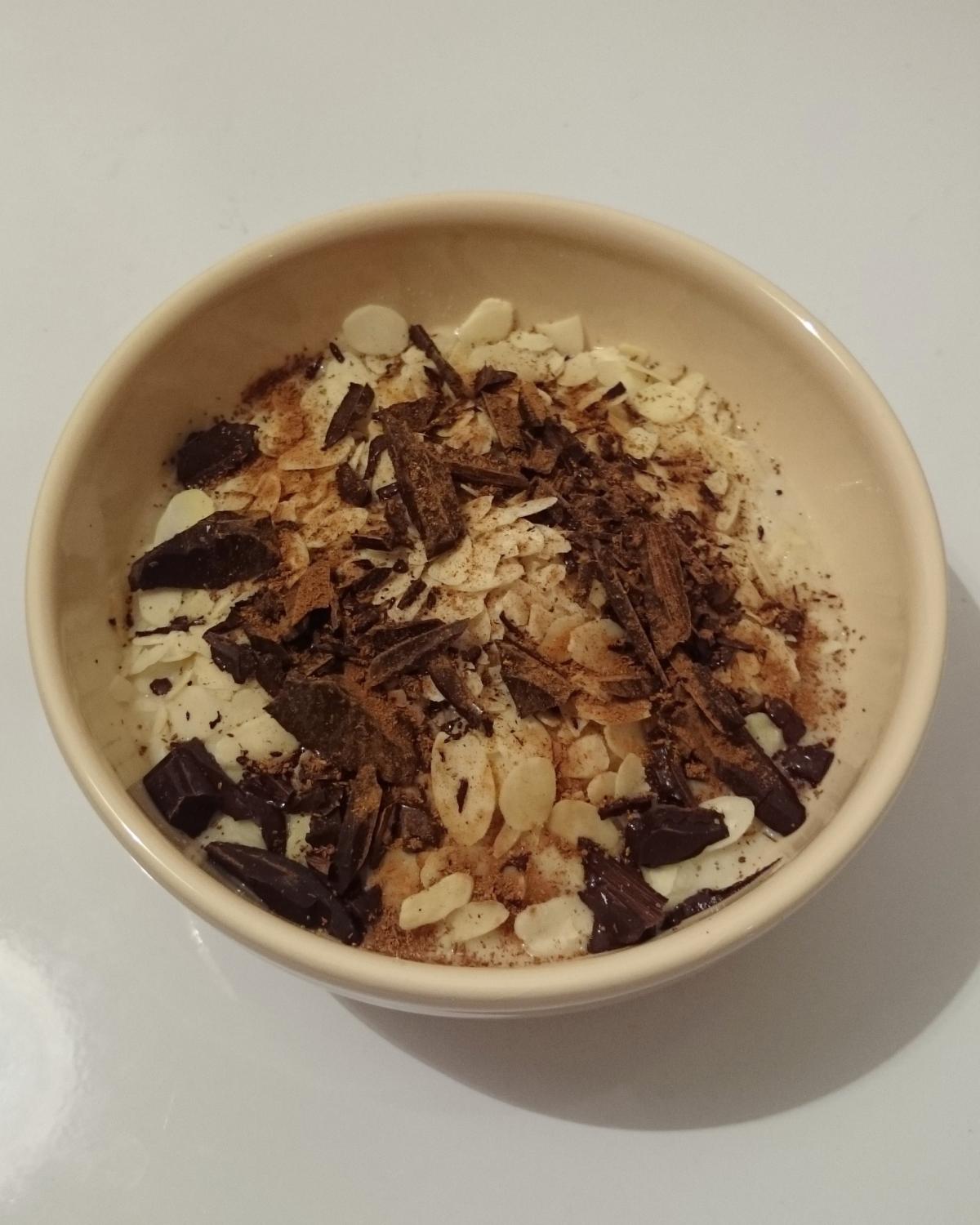 Energialaeng hommikuks – valgurikas puder tumeda šokolaadi, mandlilaastude ja kaneeliga.