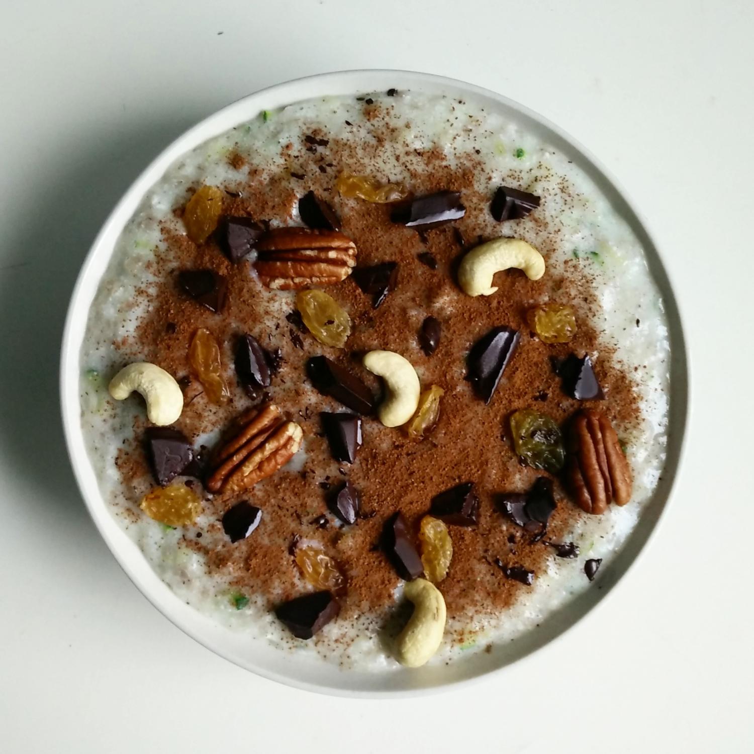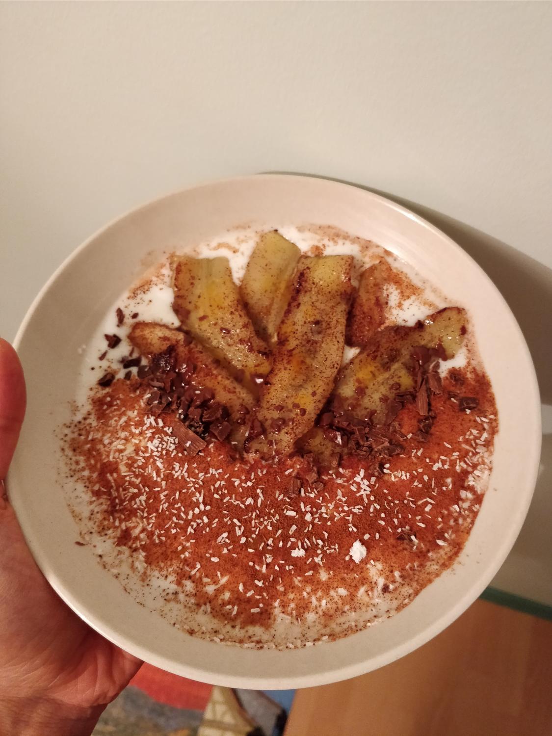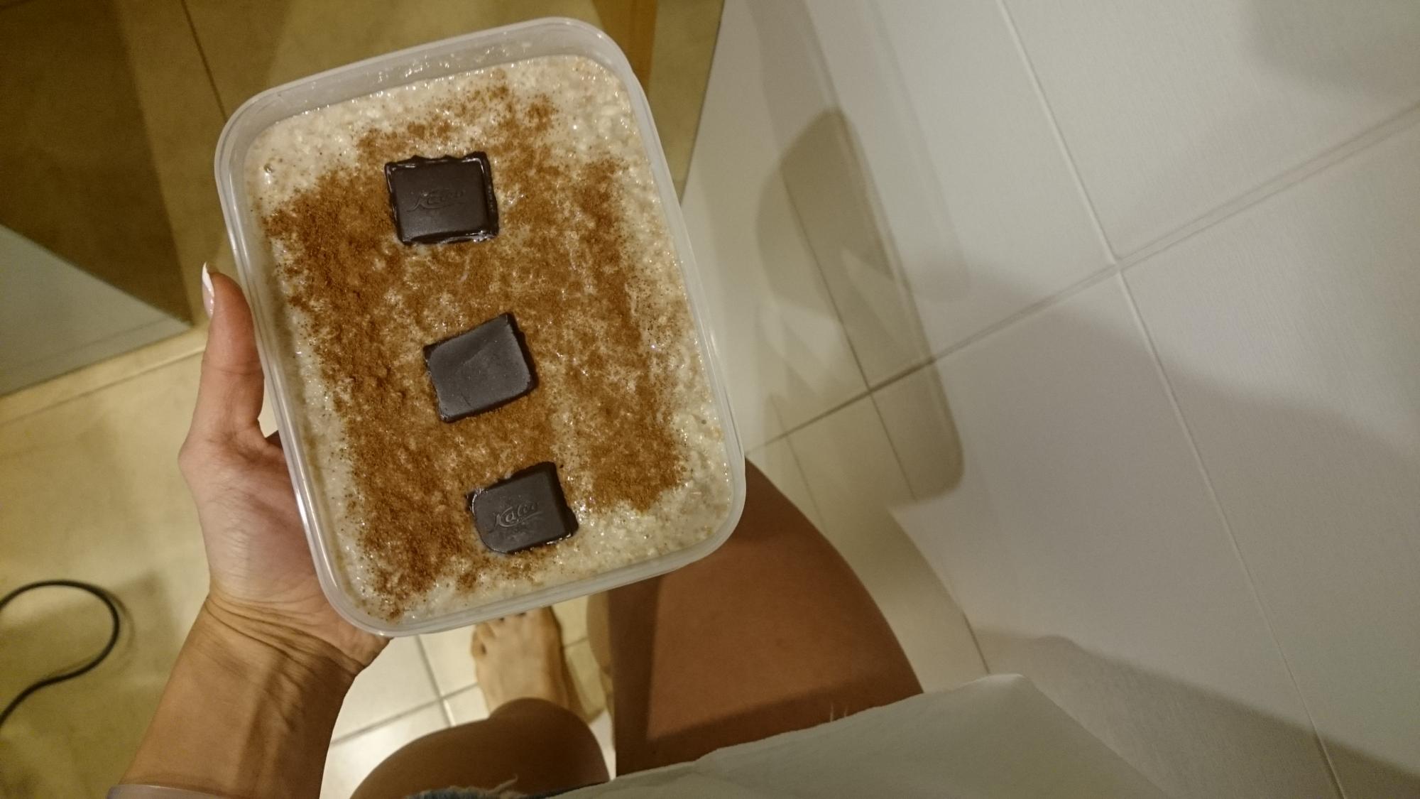 Kaerahelbed, vesi, valgupulber, kaneel, sool ja tume šokolaad