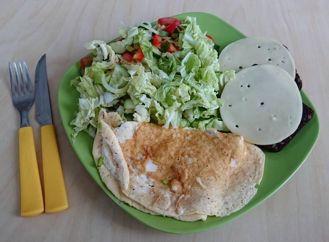 Kohupiimapannkoogid, õun, värske salat, sült, pildilt puudu must seemneleib