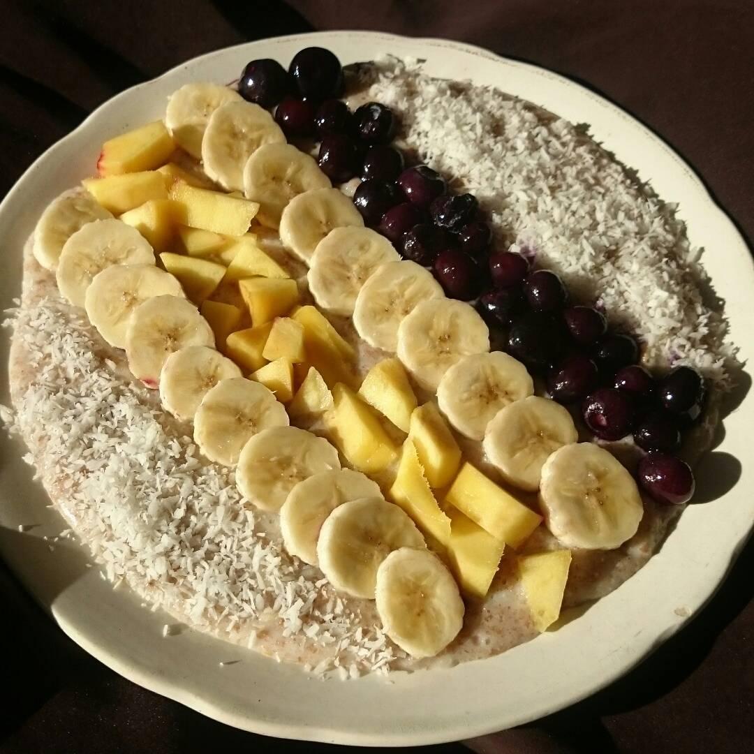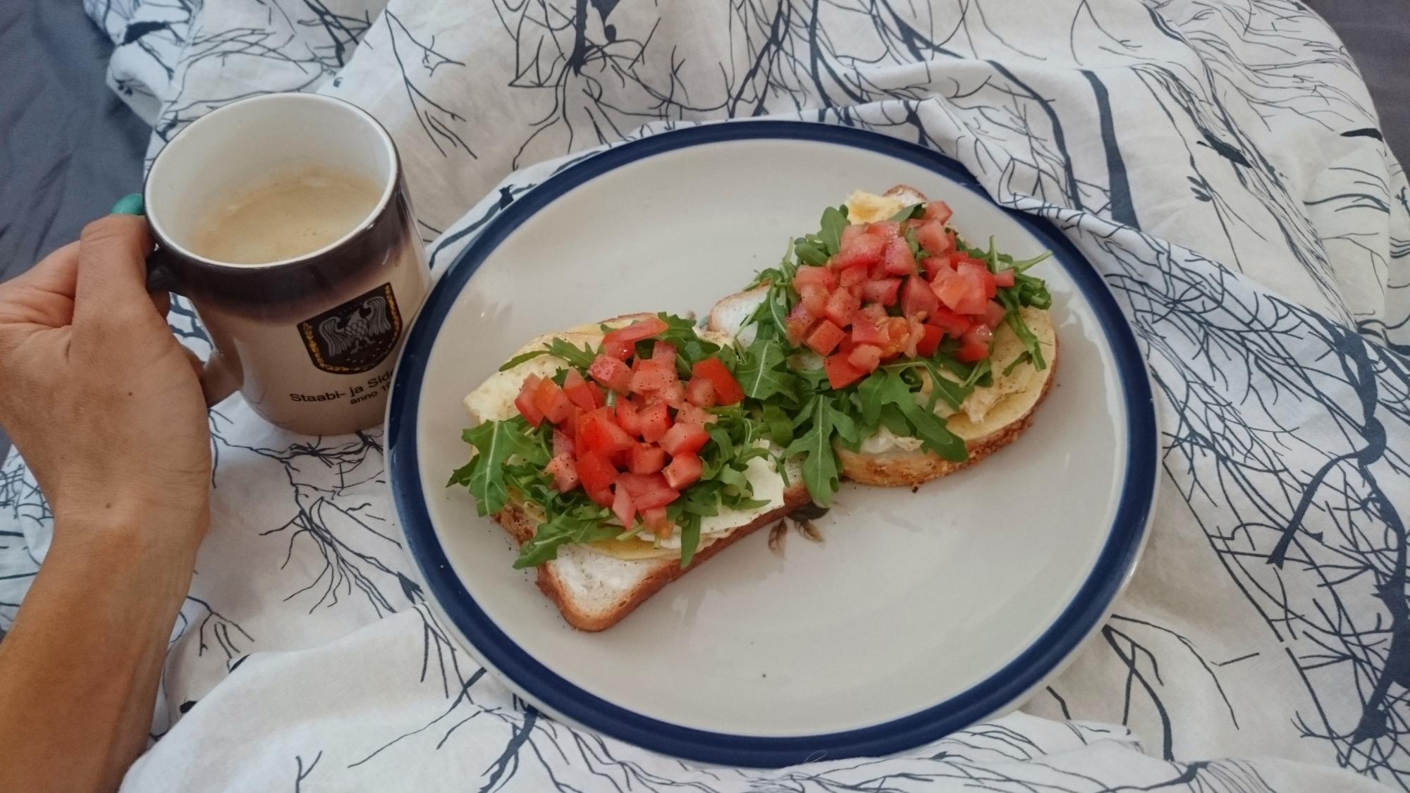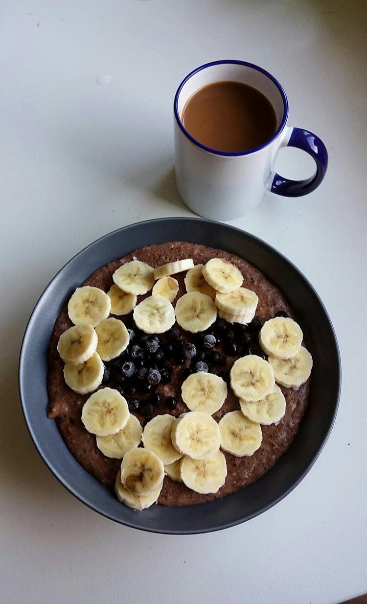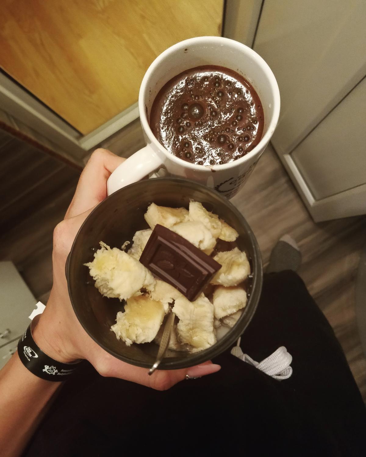 50g kaerahelbeid kaerakliidega, minimaalselt vett ja soola, üks väiksem banaan ja 16g tõmmut šokolaadi + must pätikohv