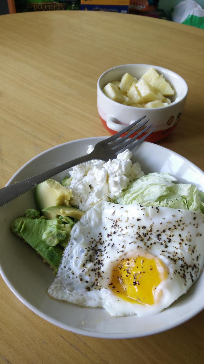 Kellel on mure sellega, et õhtul peale trenni vaaritamisek energiraasugi alles pole, siis ära muretse. Sa võid selle juba varem valmis teha ja õhtul laisalt karbikaane pealt virutada ja kahvli sisse lüüa. Nägid, et mu lõunasöögis oli 200g wokisegu? Aga kas sa tead, et wokisegu pakk kaalub 400g? Kuhu kadusid ülejäänud 200g? Ikka õhtusööki! Kuna ma eelistan viimase toidukorrana midagi sooja süüa, siis panen ikkagi panni tulele ja löön sinna kolm keskmist kodumuna (+ sool ja pipar), soojendan mikros samal ajal üleliigsed (see on muidugi nali) 200g köögivilju ja kaevan lusikaga paraja koguse avokaadot. Selle ajaga, kui juurikad taldrikule jõuavad, on munavalged kalgendunud ja saab samuti pannilt taldrikule transportida. Lihtne!