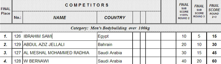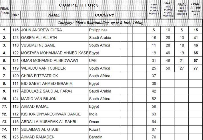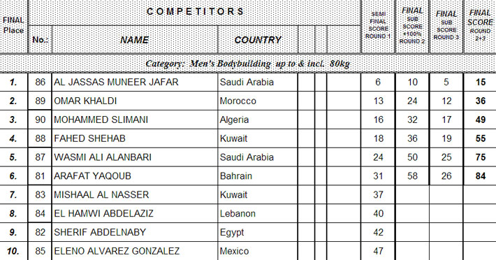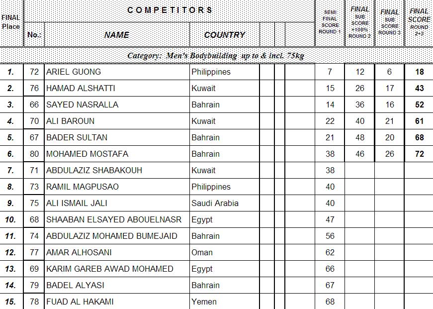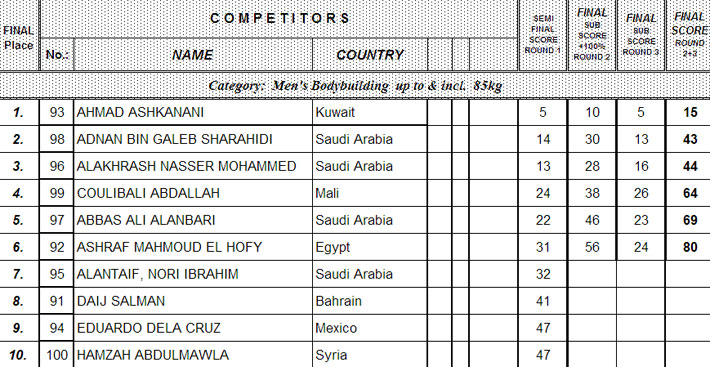 Except BB +100 kg class they are ready with the prejudging rounds. No photos available yet, but here the lists of the finalists (thanks to kuwaitbodybuilding.com).