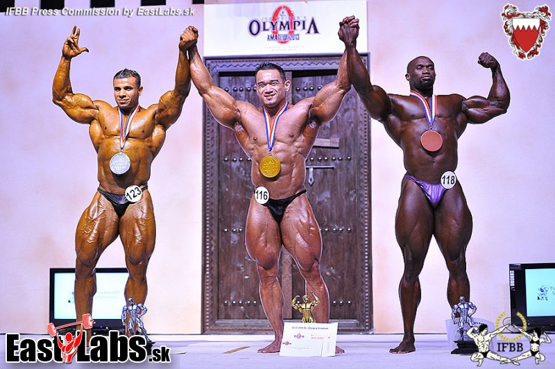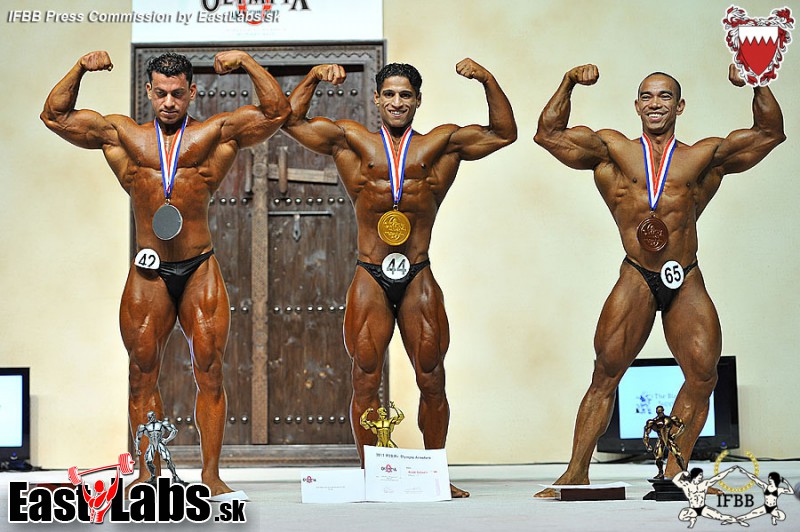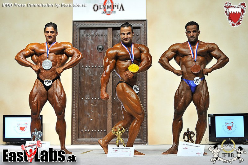 2013 IFBB Amateur Mr. Olympia over 100 kg category medal winners (from L to R): Abdul JELLALI (2nd place); Ibrahim FAHIM (1st place); Mohammed AL MESHAL (3rd place).