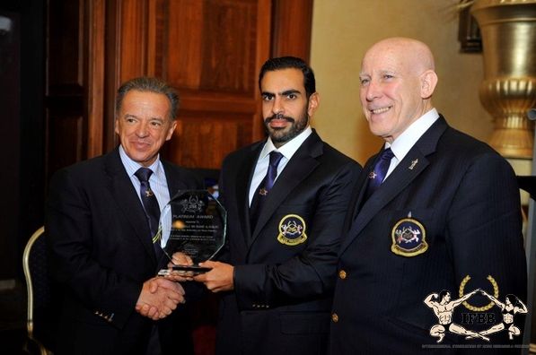 Chairman of the 2013 IFBB Amateur Mr. Olympia, IFBB Vice-President and Asian Federation President Sheikh Abdulla bin Rashid Al Khalifa was recently honoured with the prestigious IFBB Platinum Award, presented to him by IFBB President Dr. Rafael Santonja (left) and IFBB General; Secretary William Tierney (right).