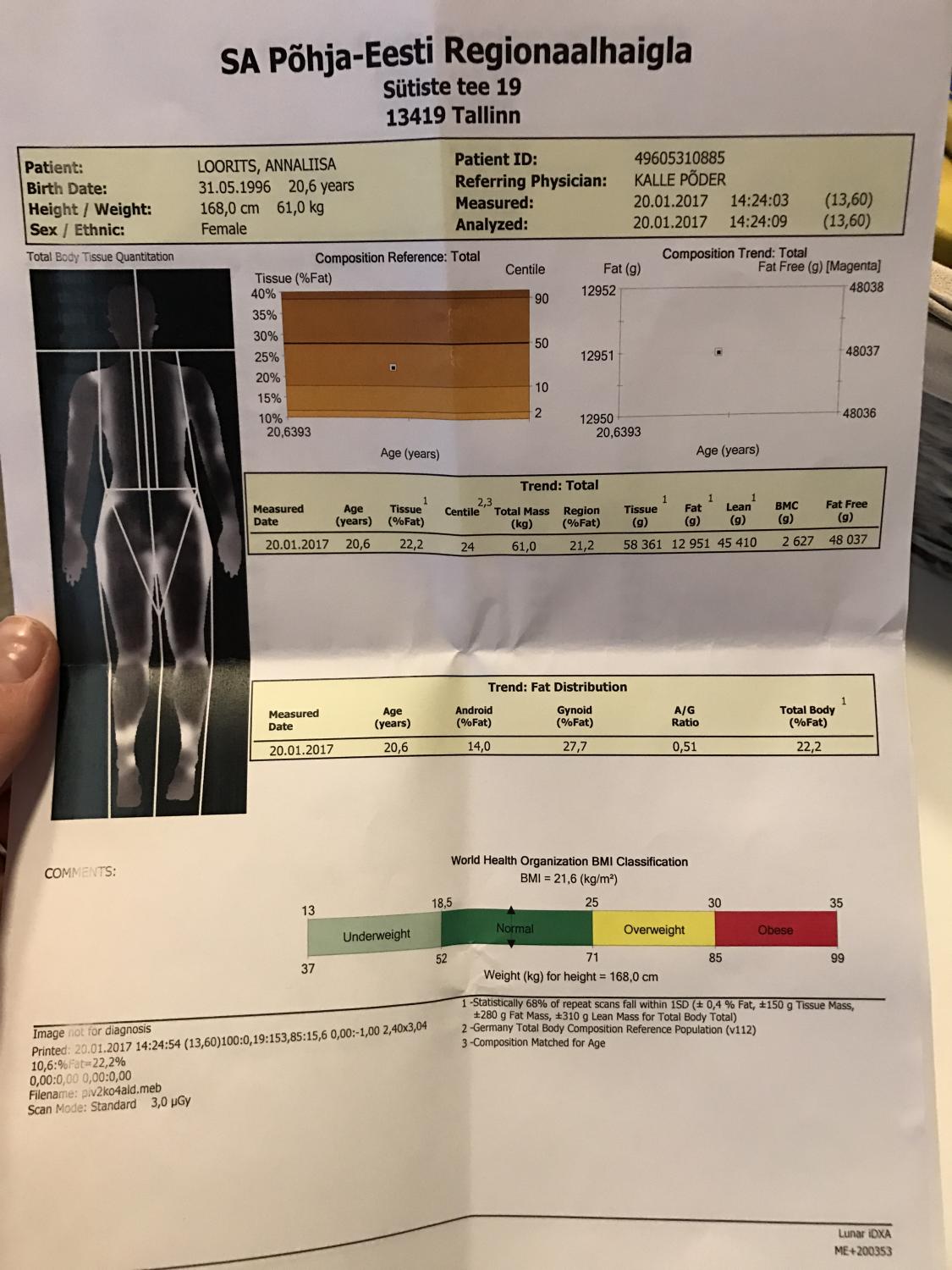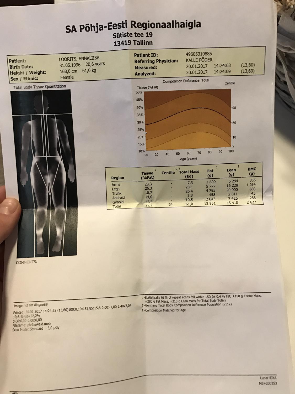Igaljuhul täna sai külastatud ka PERH-i, kus sain lõpuks täpselt teada, mis olukord tegelikult on ja millest ma õigupoolest siis tehtud olen <img decoding=” data-emoticon=”” height=”20″ src=”/uploads/emoticons/default_tongue.png” srcset=”/uploads/emoticons/tongue@2x.png 2x” title=”:P” width=”20″ /> Tuleb välja, et polegi üleni suhrkust ja jahust ja maasikavahust. A mis seal ikka häbeneda, panen siia ka oma täpsed tulemused üles, siis kõigil põnev vaadata <img decoding=” data-emoticon=”” height=”20″ src=”/uploads/emoticons/default_smile.png” srcset=”/uploads/emoticons/smile@2x.png 2x” title=”:)” width=”20″ />