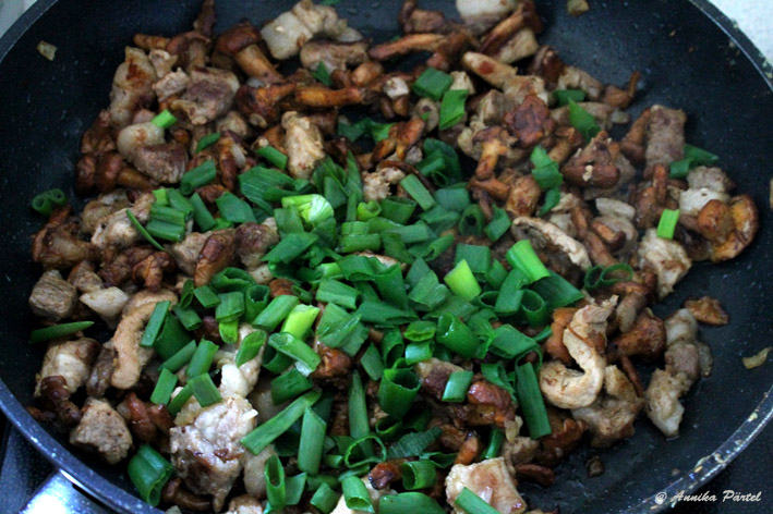 Juurde sealiha kuubikud, rohelist ja valget sibulat…