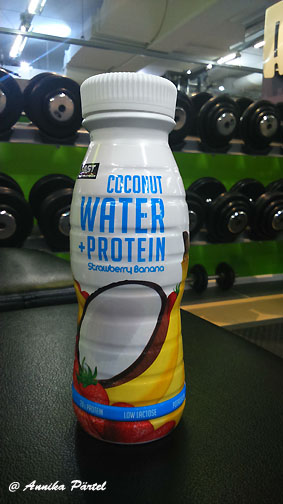 Kuna enne trenni söök jäi minimaalse ajavahe tõttu kasinaks, siis võtsin klubist lisaks ühe GIANT proteiinibatooni ja proteiini-kookosvee trenni ajal limpsamiseks: