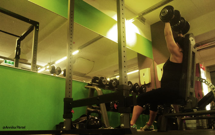 3. Istudes hantlite surumine üles 4×6 18+18kg (raseduse ajal tegin 12+12kg, 18-le oleks tahtnud veelgi juurde nüüd panna, jätsin siiski varu järgmiseks trenniks, mil pean nagunii raskusi lisama)