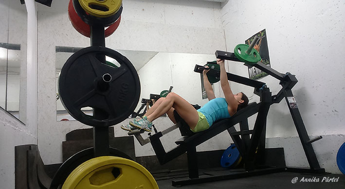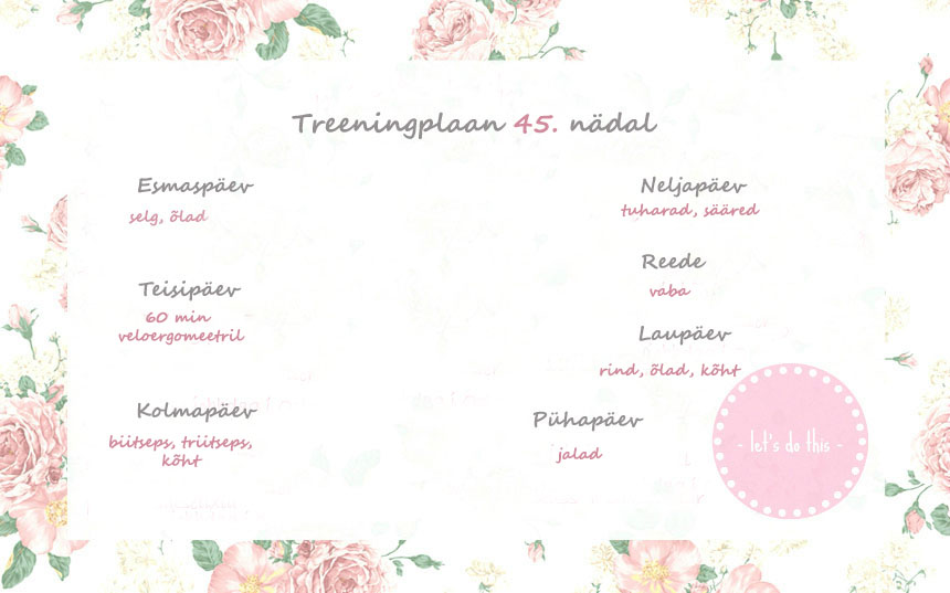 Treeningud toimuvad ikka vanaviisi, olen siiski kavade osas toiminud vabamalt- pannud paika lihasgrupid, mida millisel päeval, harjutused on aga vabalt valida. Korra nädalas satun treenima Lasnamäe HC Gym-i, kus on võimalik teha veidi kõvem jalatrenn (jalga on 2x nädalas, samuti õlgu).
