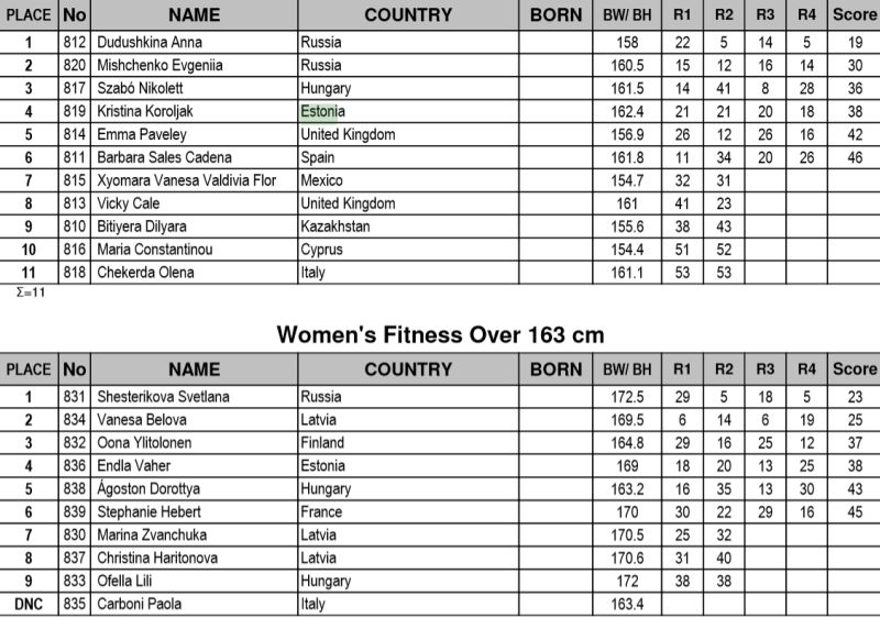 MemberEi olnud eestlannadel sel võistlusel õnne, bikiinid ei jõudnud lavale ja fitnessistidel mõlemil 4. koht….kuid sport juba on kord selline, et võita kogu aeg ei saa. Endlal jäi pronks vaid 1 punkti kaugusele, ulme tulemuse on teinud muidugi Vanessa Belova, kes on alles 15 aastane ja 2 punkti on jäänud Arnold Classicu võidust….ma ei tea kui nii vara jõuad juba naiste seas tippu ,kuhu sealt edasi on minna….Mis seal ikka uued võistlused tulevad ja siit saab ainult paremaks.
