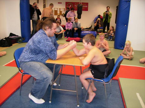 Eesti sumomaadleja Kaido Höövelson alias Baruto külastas K&F sumokooli. Väikesed poisid said oma iidoliga jõudu katsuda.