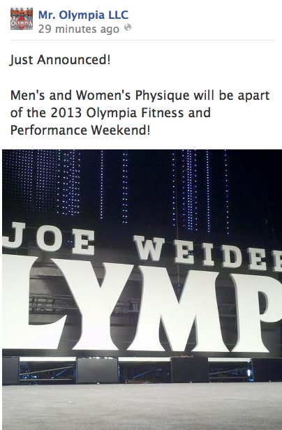 And talking about the Olympia; Mr Olympia LLC announces; women’s and men’s physique will be at 2013 Olympia!