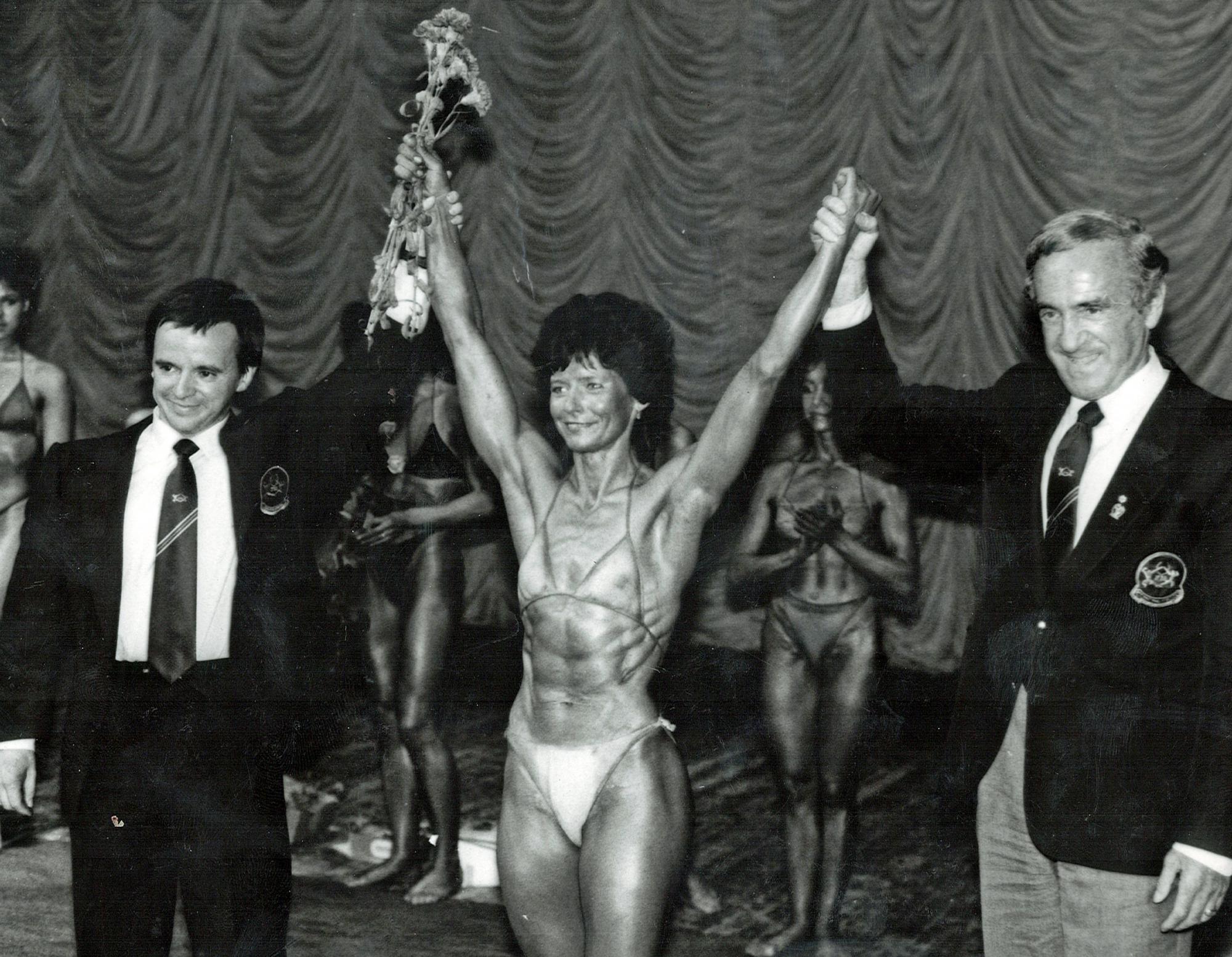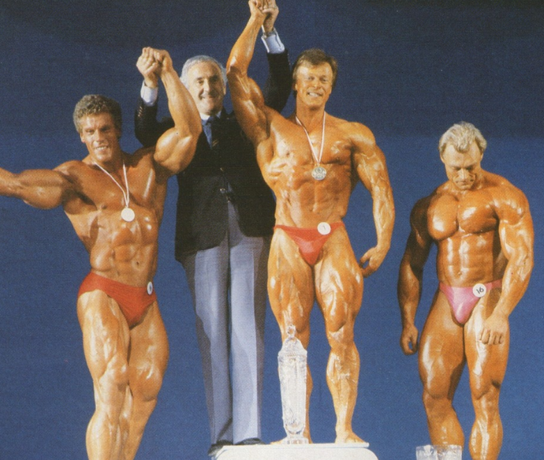 Autasutamine Euroopa meistrivõistlustel 1986.a.Varsavis. Võitja, Olevi kätt tõstab Ben Weider isiklikult.