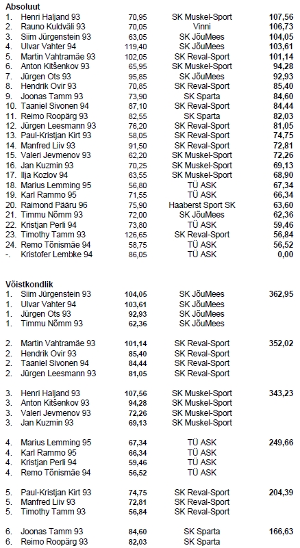 MemberVaatasin võistlusi otseülekandes netist ja kohtunike töö oli minu arvates väga hea. Siiski ei saanud paaril korral täpselt aru, milles probleem ja mis põhjusel katset ei loetud. Marko, mis selle Eleri Õismaa surumise stardiasendiga oli? Ja miks ei loetud Margus Silbaumi 2. ja 3. katset ära? Rohkem küsimusi minu jaoks ei tekkinudki, vaatamata ülekande mitte just hiilgavale kvaliteedile