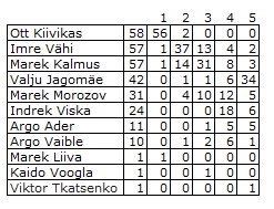 59 ennustaja hulgas pakuvad 58, et Ott on meeste absoluudi esiviisikus, 57, et Marek Kalmus ja Imre Vähi. Teisi pakutakse vähem.