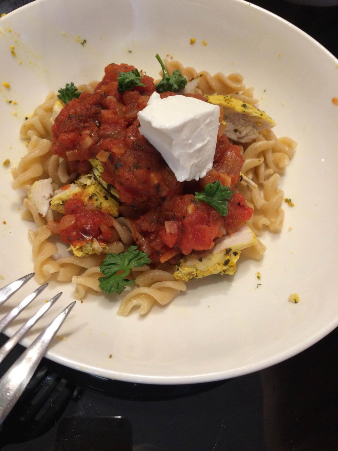 Паста цельнозерновая а-ля болоньезе с запеченым куриным филе, томатами с базиликом и капелькой козьего сыра (11% fat)