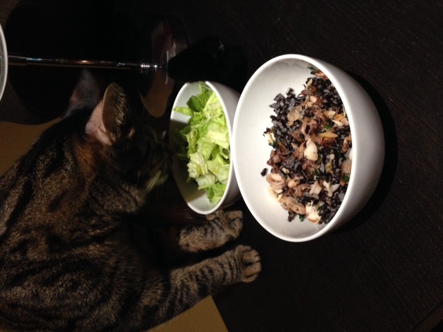 ” srcset=”/uploads/emoticons/wink@2x.png 2x” width=”20″ height=”20″>Meil on kass ka väga fit sööb salatit hea meelega. Pildil on must riis mereannitega.