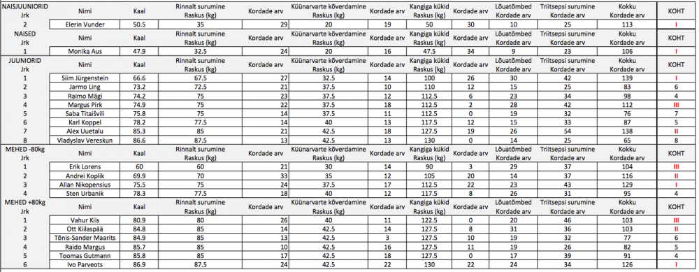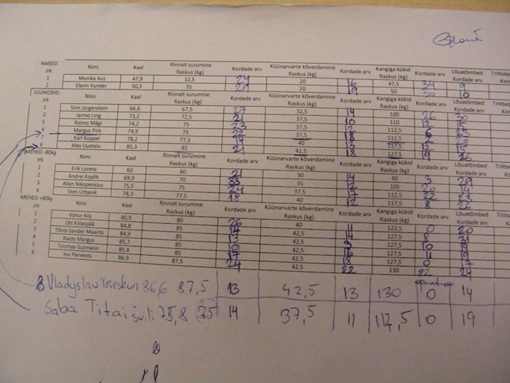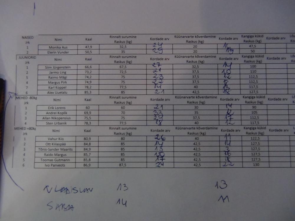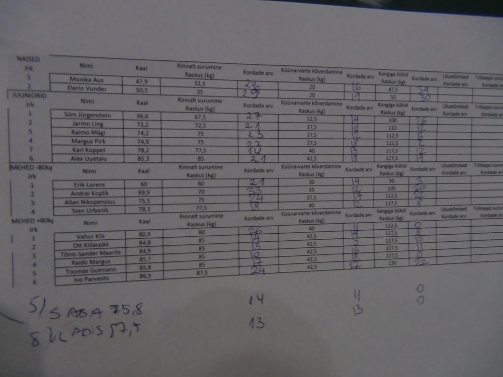 ” srcset=”/uploads/emoticons/smile@2x.png 2x” width=”20″ height=”20″>Juunior meestest kõige rohkem kordusi Siim Jürgensteinil (27 kordust), mehed +80kg Andrei Koplik, temal tuli 33 kordust, mehed +80kg tegi kõige rohkem kordusi Vahur Kiis ehk neid tuli tal kokku 26. Tublid muidugi kõik!