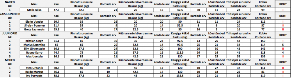 MemberTartus 17 võistlejat – kui keegi ennast ei leia, andke teada. Mehed on sel korral samas kategoorias (Sten Urbanik, kes oli ainus -80 kg võistleja, on juba kvalifitseerunud EMVle, seega ei muda see kvalifitseerumist +80 kg meestele).