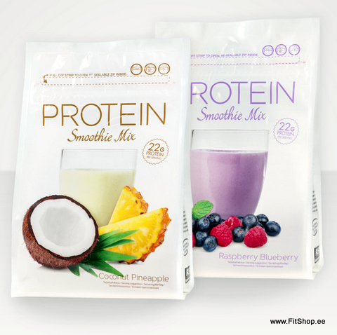 PROTEIN SMOOTHIE MIX on madala laktoosi ja suhkru sisaldusega valgujoogipulber. Piimaga segatuna valmib smuuti sarnane valgujook.Valikus on lausa kaks erinevat maitset: kookose-ananassi ning vaarika-mustika oma.