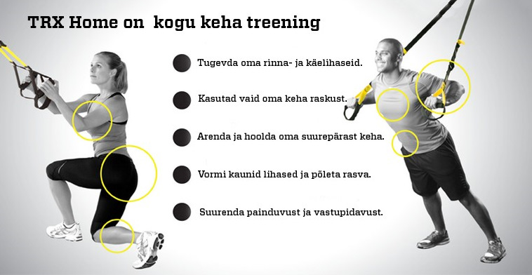 TREENINGU KINDLAKS ÕNNESTUMISEKS SISALDAB IGA TRX KOMPLEKT KASUTUSJUHENDIT, NÄPUNÄITEID TREENINGUKS NING KVALITEETSET JA VASTUPIDAVAT TRX SUSPENSION TRAINER TREENINGSEADELDIST.