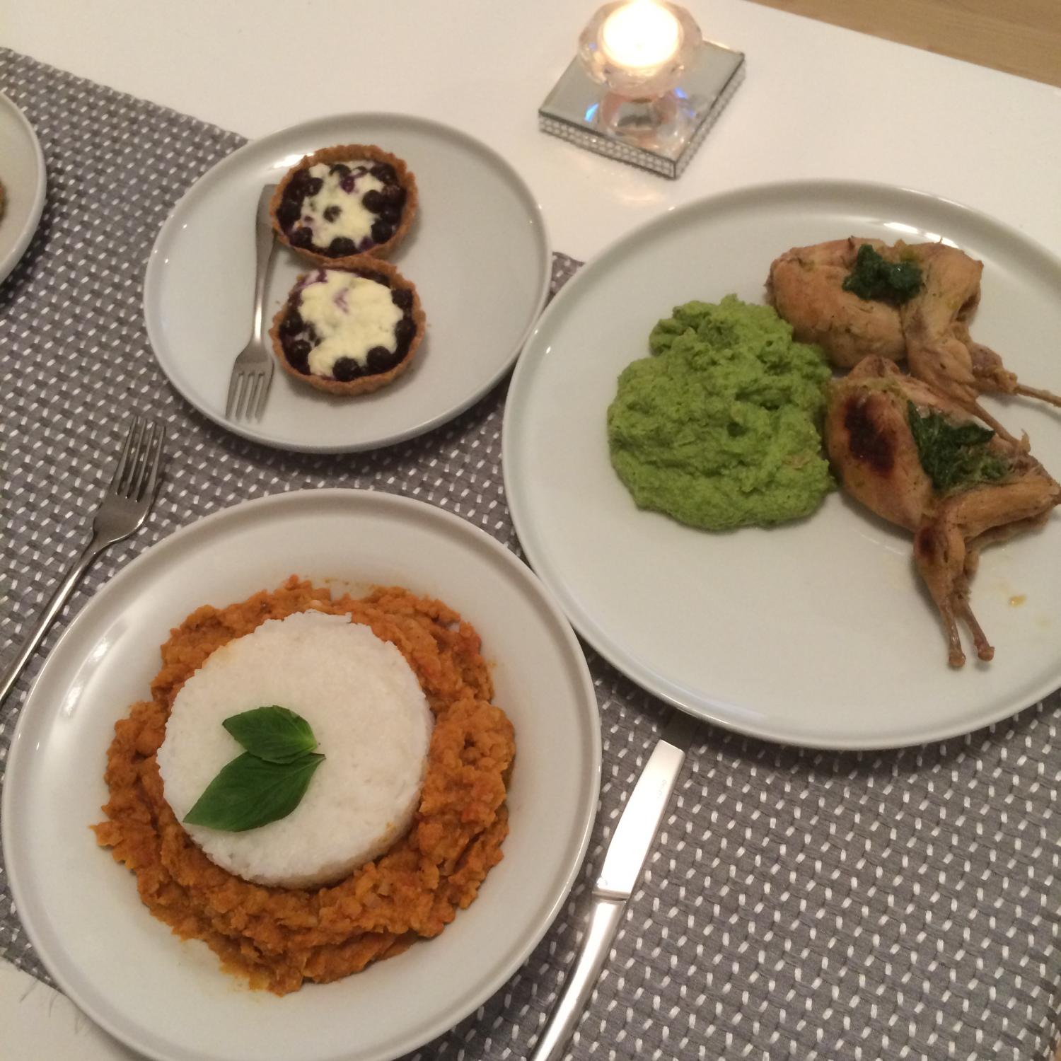 Kikerherne karri, kauaküpsetatud vutt (salsa verdega), herne-mündi püree ja magustoiduks mustika-toorjuustu tartlett