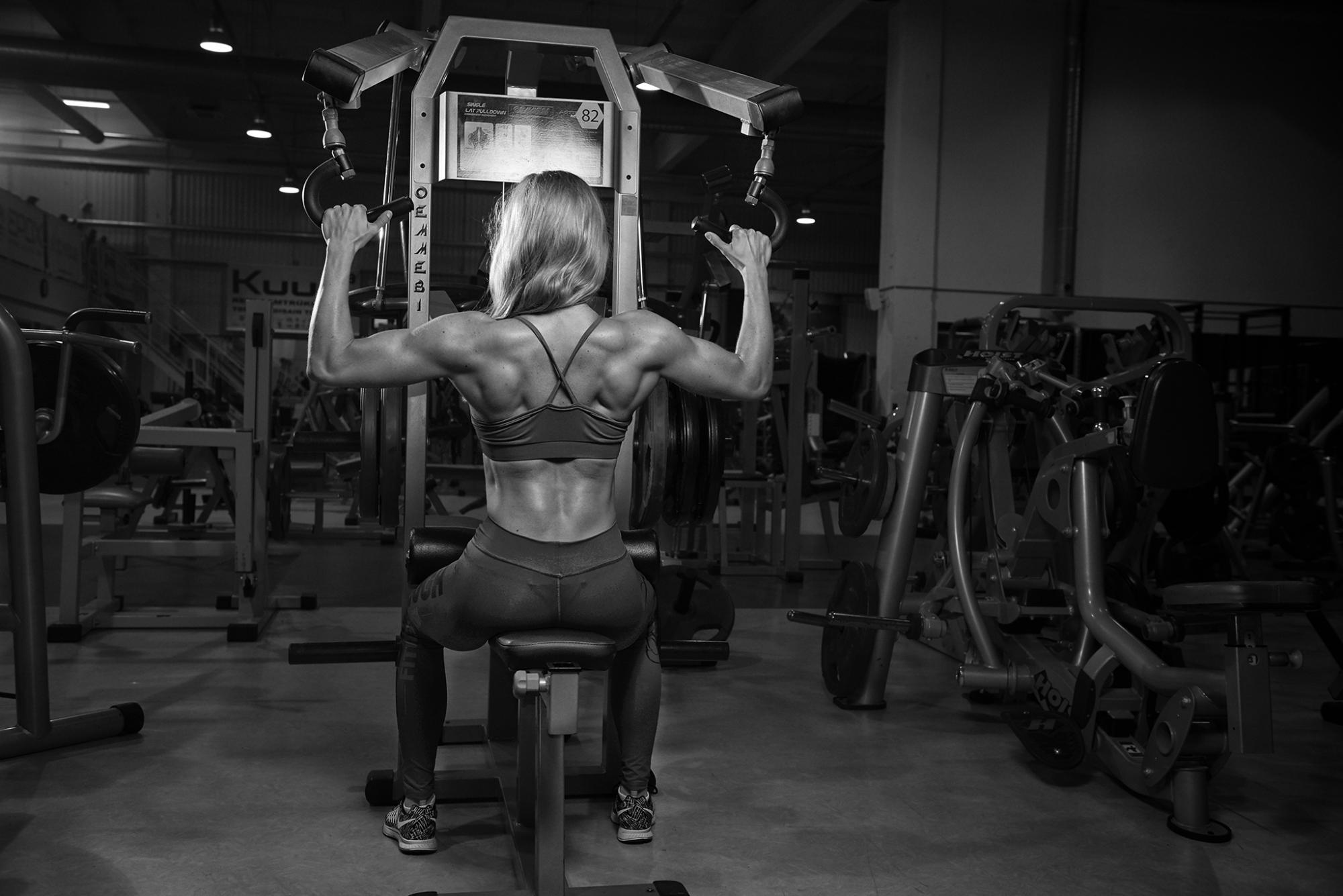 Jõusaalis olen jaganud oma päevad kolmeks- need mis bikiinis (ja mu enda puhul) enim arendamist vajavad- selg, tagumik(jalad) ja õlad. Kõik muu “pisike” mahub sinna kuskile vahele. Kuna ma suuremat sorti puhkaja seeriate vahel ei ole, siis vahel teen näiteks selja päeval mõne rinna harjutuse seeriate vahele. Üldiselt aga rinda väga eraldi ei treeni ja käed mahuvad ka teiste päevade sisse (neile suurt rõhku hetkel ei pööragi, kuna on juba piisavalt lihaselised). Kõhtu treenin köögis