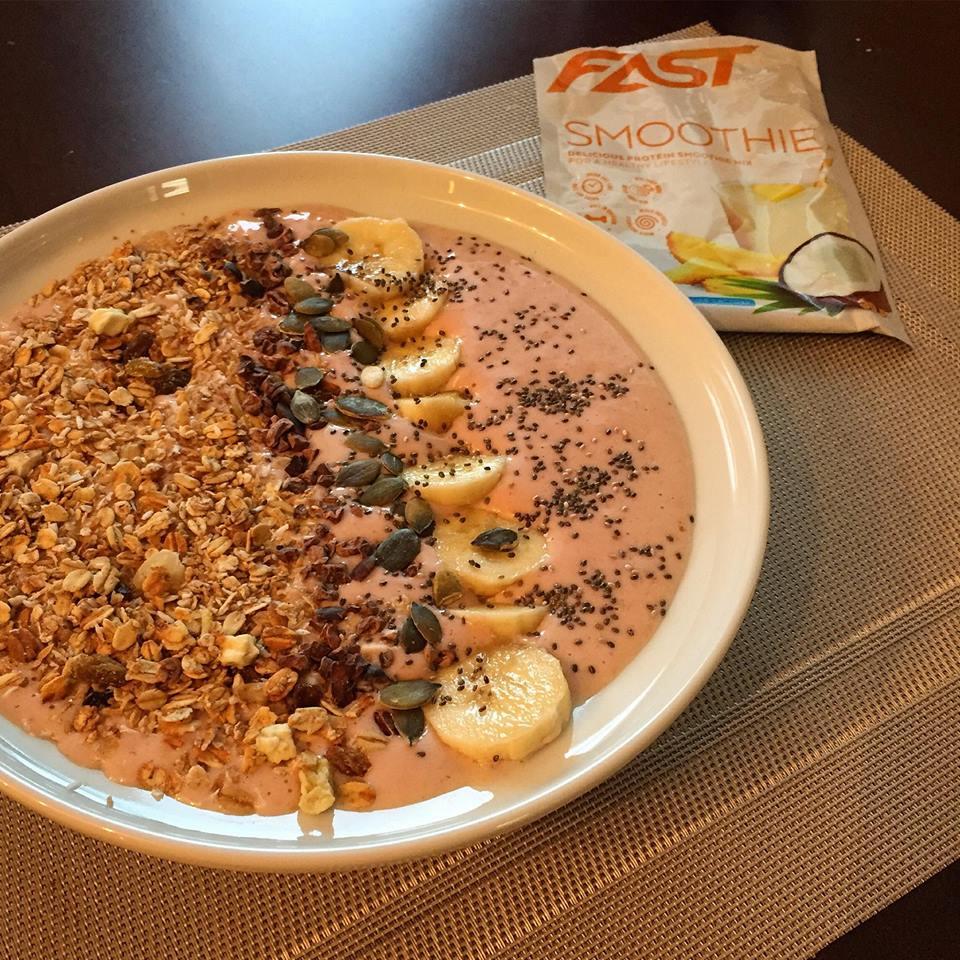 Hommikut alustasin eile smoothie-kausiga (Fast smoothie mix, piim, banaan, külmutatud mango ja vaarikad). Peale müsli ja seemned.