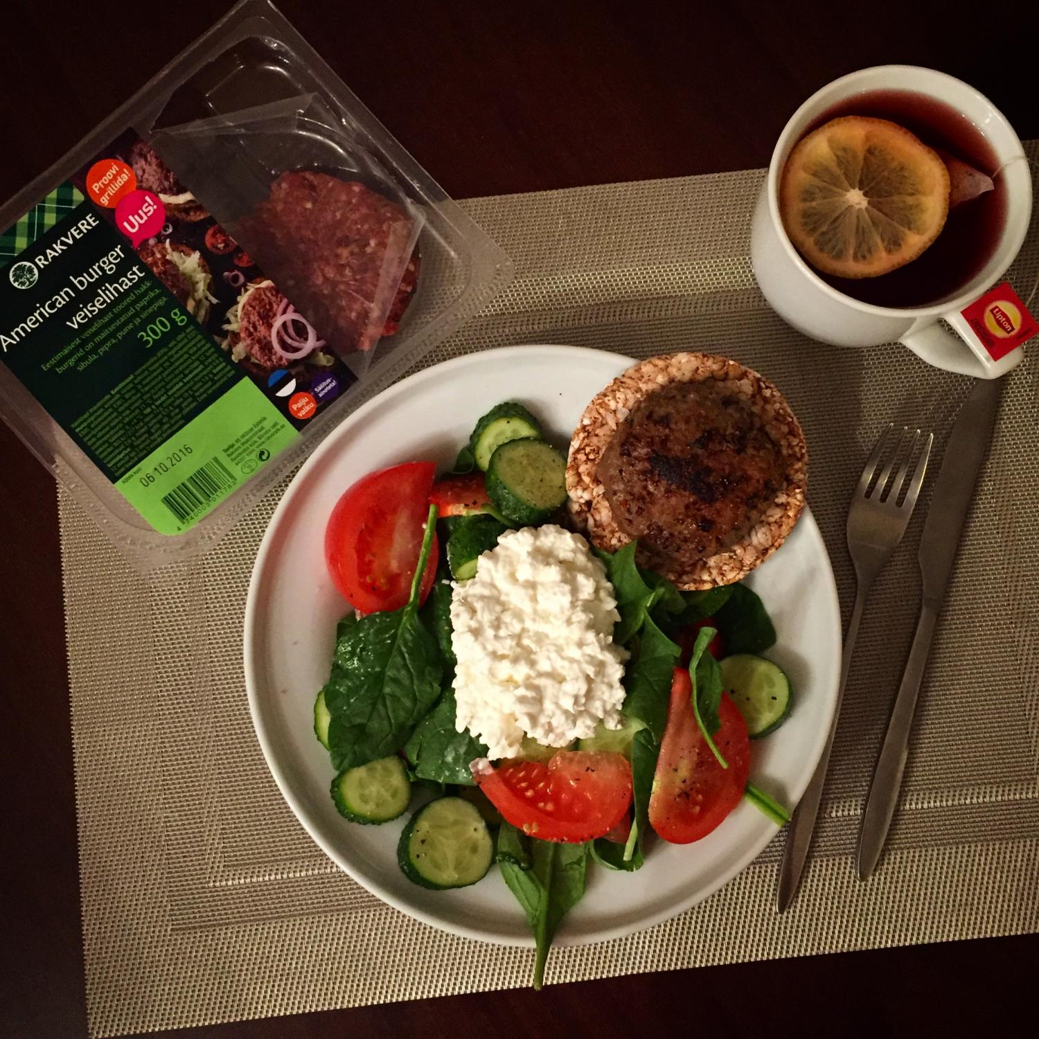 ” width=”20″ />Lõppu üks pilt elsest õhtusöögist- tatra galetil veiseliha burger, kõrval värske salat kodujuustuga. Kotlett seest ikka pool-verine, nii nagu on kõige parem