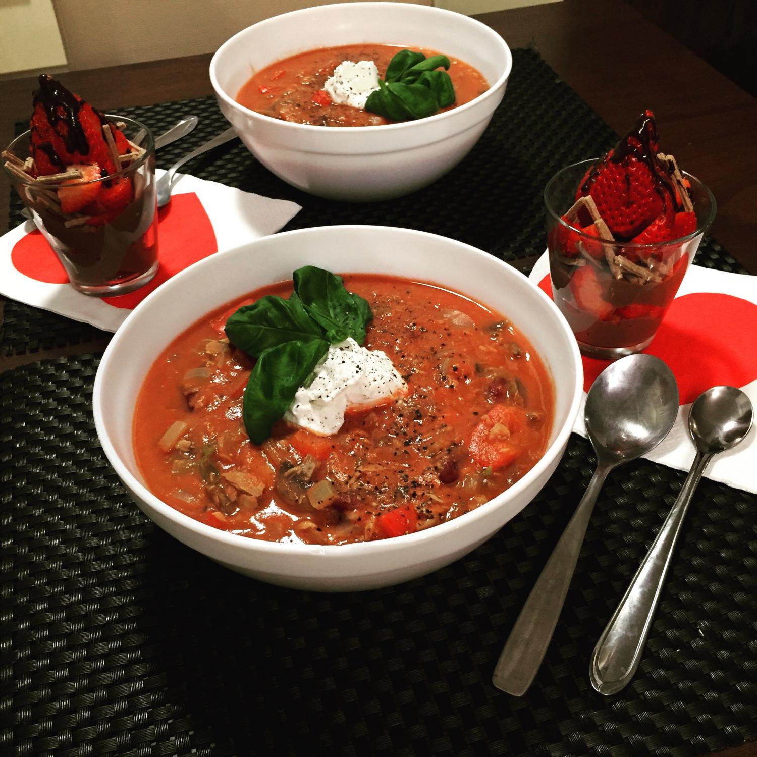 ” width=”20″ />Õhtuks vürtsikas tuunikala supp kitsejuustuga, magustoit koosnes Pudixist, krõbinatest, maasikast ja tumedast šokolaadist (kihiti). Väga väga maitsev ja suhteliselt kalorivaene!