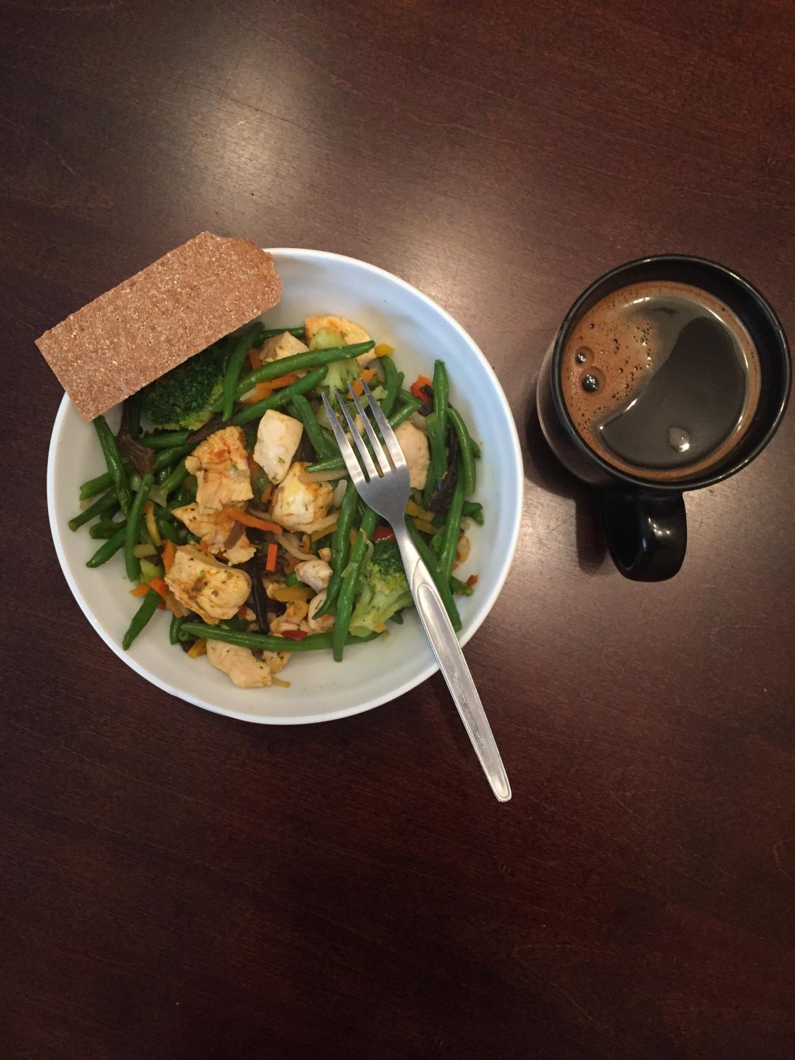 Koju jõudes panen esimese asjana trenni riided pessu ja asun siis õhtusööki tegema. Kui päeva keskmised 3 toidukorda tulevad karbist, siis hommik ja õhtu teen värskelt. Üldiselt on plaan teada ja vaja vaid MyFitnessPal avada, kogused üle kontrollida/meelde tuletada ja kõik pannile kokku visata. Ükski toit ei valmi mul üle 15 minuti.