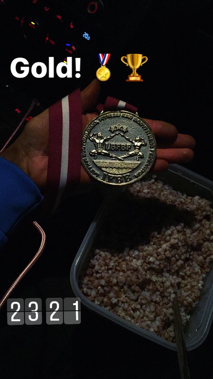 ” width=”20″ />Võistluspäevaks oli mul planeeritud jooksvalt söömiseks 10 riisigaletti (iga üks 40cal) ja 100g (kuivainena) keedetud basmatiriisi+ pudeliga mett. Kõik kõrge süsivesikusisaldusega ja vähemahukad toidud. Rasval ja valgul ei ole võistluspäeval tavapärast osakaalu (vähemalt mitte enne lava). Katsusin iga tunni tagant natukene ampsata- et oleks energiat ja kõht ei koriseks. Vahele natuke ka vett ja musta kohvi.