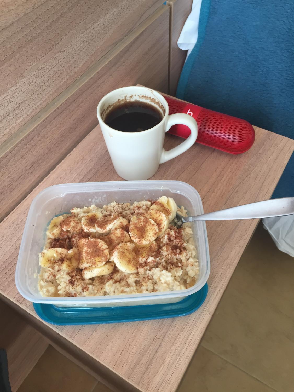 Alustasin hoopis oma päeva tavapärase pudruga- või noh, tavaliselt olen ma võistluspäeva hommikul 100g helvestest putru teinud aga seekord oli paki lõpp ja tegin kokkuvõttes 130g. Peale banaani, mett, kaneeli- hingasin selle ilma igasuguste probleemideta sisse. Kõrvale üks must kohv. Enne võistluspäeva ma ka oma menüüd kuidagi ei muutnud, viimane nädal oli umbes 1700 cal peal (ilmselt isegi rohkem sest liikumist oli palju ja lõunasöögiks söödavaid köögivilju ma ei kaalunud).
