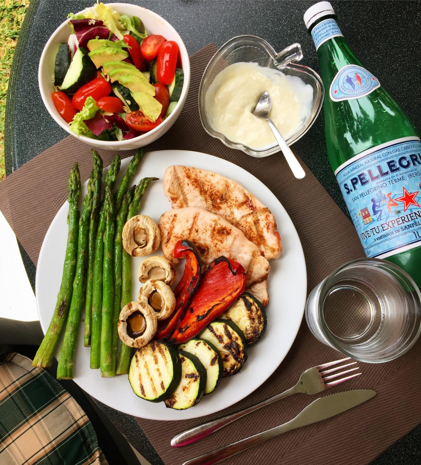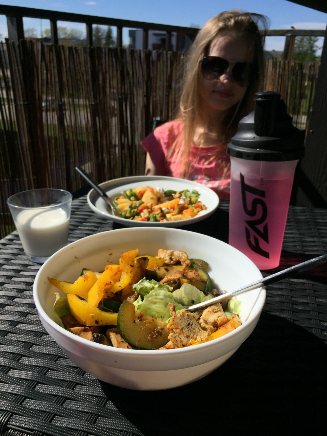 Ja mõnusalt päikseline lõunasöök rõdul koos tütrega. Kausis hetke absoluutne lemmik- põhjaks jääkapsas jogurti, küüslaugu ja dijoni sinepi kastmega, peale kergelt Gheega praetud köögiviljad (paprika, suvikõrvits, seened) ja kana. Lihtne, kiire, toitev ja maitsev