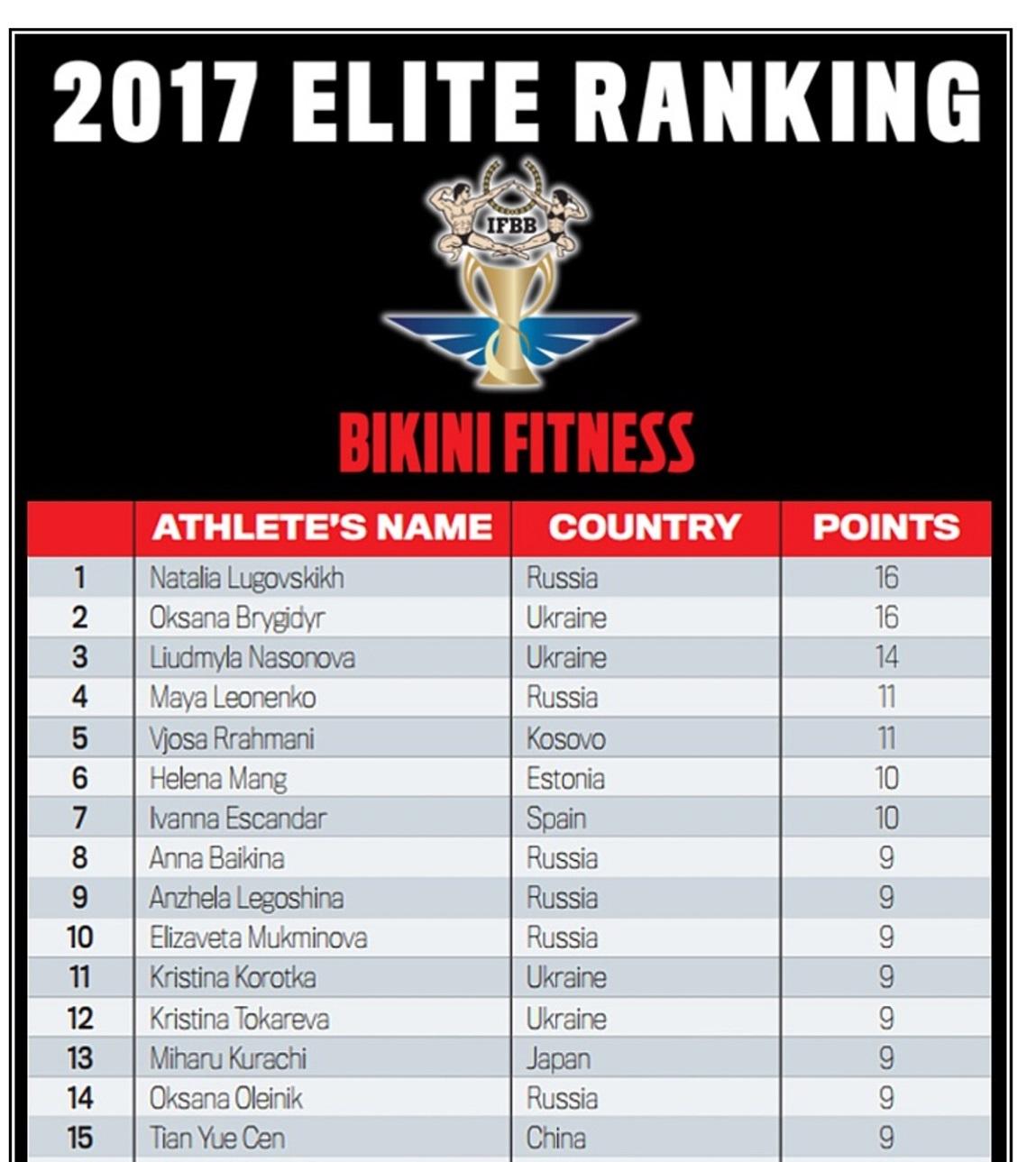 ” width=”20″ />Hetkel olen IFBB poolt koostatud Elite Rankingu tabelis ülikõrgel, 6. kohal ja sügisese hooaja eesmärgiks on kindlasti käia just nendel võistlustel, kus punkte jagatakse, et kohta säilitada ja miks mitte ka tõsta. Kokku on tabelis hetkel 117 bikini võistlejat üle maailma erinevatest pikkuse kategooriatest. Uhke tunne küll!