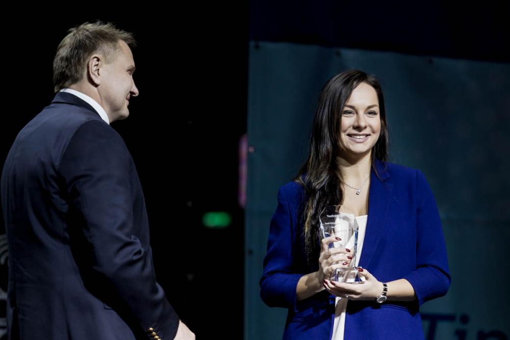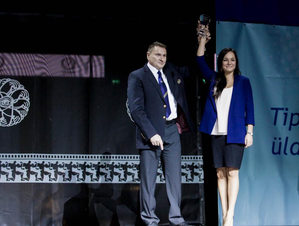 EKFL president Arnold Tokko ja õhtujuht Ott Kiivikas tutvustavad bikinifitnessi absoluutvõitja karikat,