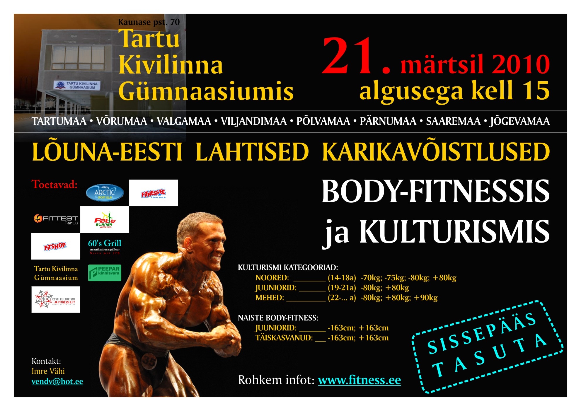 Võistluste plakatid jõuavad täna kl 15:00 Fitshop Tartu Eedeni kauplusesse ja huvilised saavad neid sealt jagamiseks võtta! Pange need plakatid üles oma kooli-töökoha teadetetahvlile, samuti spordiklubide teadetetahvlile! Väga suurt reklaami kuskil ajalehes selle kohta ei tee kuna Kivilinna Gümnaasiumi aula on suhteliselt pisike ja arvatavasti tuleb juba niisama kaasaelajaid(koolikaaslased-sugulased-tuttavad-kulturismihuvilised) terve saalitäis. Kindlasti lisan siia veel lisainfot, mis puudutab võistluste logistilist poolt- parkimine, üleriided, pesemisvõimalused jne.