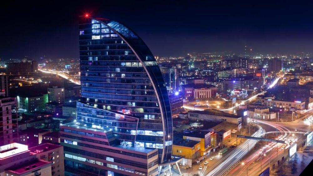 Ulaanbaatar at night, with the tallest building in Mongolia – The Blue Sky Hotel & Tower (105 m, 25 stores) in the foreground.