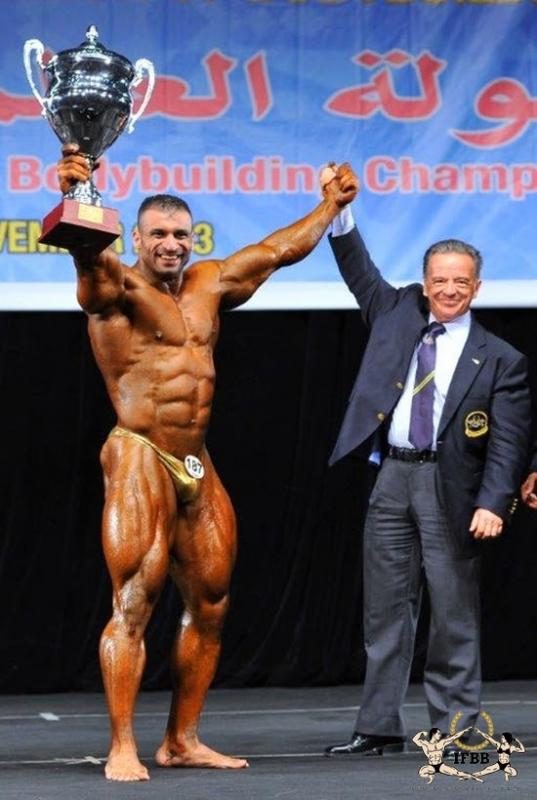 2013 IFBB World Men’s Bodybuilding Championships Overall Winner, Mohamed ZAKARIA (Egypt), congratulated by the IFBB President, Dr. Santonja.