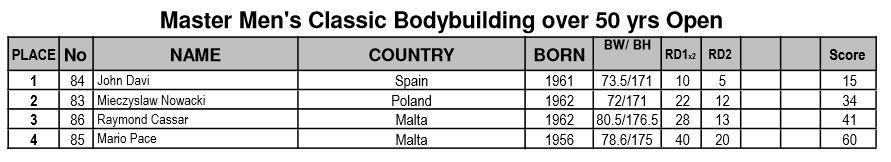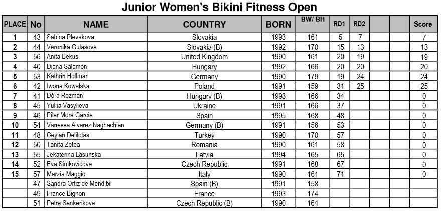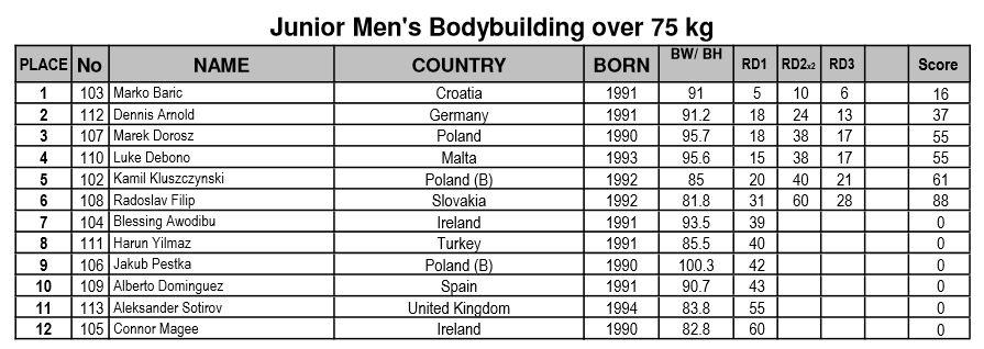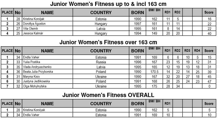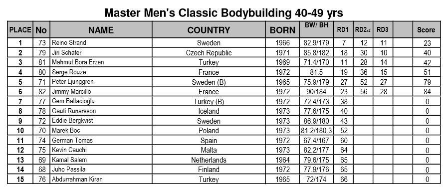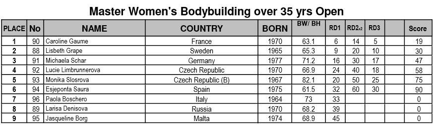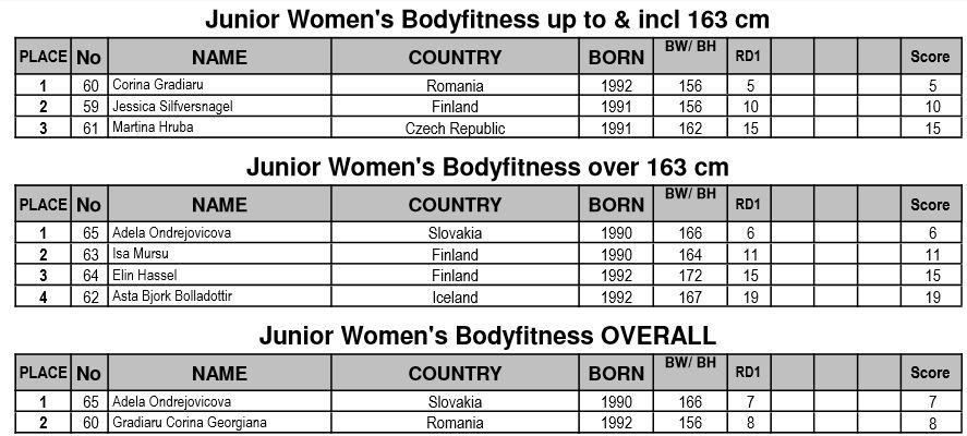 IFBB Women’s European CC 2013 Kristina Koroljak, Endla Vaher, Esta Pilt: kokku 3 kulda ja 2 hõbedat! Avaleht » Forums » International » Võistlused / Events » IFBB Women’s European CC 2013 Kristina Koroljak, Endla Vaher, Esta Pilt: kokku 3 kulda ja 2 hõbedat! This topic has 257 replies, 29 voices, and was last updated 12 years, 9 months tagasi by AnneP. Viewing 15 posts - 151 through 165 (of 258 total) ← 1 2 3 … 10 11 12 … 16 17 18 → Autor Postitused mai 4, 2013 at 5:09 e.l. #342074 AnnePMember The official results from the day 2 are available here // http://www.ifbb.com/pdf/2013_ssusanna/2013-SantaSusanna_Juniors_results_03.05.2013.pdf And photos are finally online; Eastlabs galleries -> http://www.eastlabs.biz/gallery/1603 Team-andro, day 2 part 1 -> http://www.team-andro.com/coppermine/thumbnails.php?album=1675 mai 4, 2013 at 5:28 e.l. #342075 AnnePMember Fitness juniors up to and incl. 163cm Koroljak (1.) – Olenik (3.) – Agoston (2.) Fitness juniors over 163cm; Andryuschenko (3.) – Vaher (1.) – Postika (2.) mai 4, 2013 at 5:32 e.l. #342076 AnnePMember Fitness juniors over all; mai 4, 2013 at 5:43 e.l. #342077 AnnePMember Fitness men juniors; Sergii Hordieiev (1.) – Stefan Hirna (2.) – Visan Mihata (3.) mai 4, 2013 at 5:54 e.l. #342078 AnnePMember Bikini fitness juniors; Hollman (5.) – Gulasova (2.) – Plevakova (1.) Gulasova (3.) – Kowalska (6.) – Bekus (3.) Salamon (4.) – Hollman (5.) – Plevakova (1.) mai 4, 2013 at 6:08 e.l. #342079 AnnePMember BF juniors up to and incl. 163cm Martina Hruba (3.) – Corina Gradiaru (1.) – Jessica Silfversnagel (2.) BF juniors over 163cm; Adela Ondrejovicova (1.) – Elin Hassel (3.) – Isa Mursu (2.) mai 4, 2013 at 6:13 e.l. #342080 tarmopMember Krissu oli kuivusega teistest üle ja Endal võitis tänu oma kõhulihastele ” srcset=”/uploads/emoticons/smile@2x.png 2x” width=”20″ height=”20″> Palju õnne medalistidele ja nende trennadele! mai 4, 2013 at 6:13 e.l. #342081 AnnePMember BF jun. over all; mai 4, 2013 at 6:19 e.l. #342082 AnnePMember Junior men’s physique; Sami Hamididi (2.) – Robin Balogh (1.) mai 4, 2013 at 6:33 e.l. #342083 AnnePMember Master men CBB 40-49 years; Jiri Schafer (2.) – Reino Strand (1.) – Peter Ljungren (5.) Jimmy Marcillo (6.) – Mahmut Erzen (3.) – Serge Routze (4.) mai 4, 2013 at 6:48 e.l. #342084 AnnePMember Master men CBB over 50 years; Raymond Cassar (3.) – Mario Pace (4.) – John Davi (1.) Mario Pace (4.) – John Davi (1.) – Mieczyslaw Nowacki (2.) mai 4, 2013 at 6:53 e.l. #342085 AnnePMember Master Men CBB over all; mai 4, 2013 at 7:04 e.l. #342088 AnnePMember Master women’s bodybuilding over 35 years; Michaela Schar (3.) – Caroline Gaume (1.) – Lisbeth Grape (2.) mai 4, 2013 at 7:17 e.l. #342089 AnnePMember Junior men’s bodybuilding up to and incl. 75kg Maksymelian Berezovskyi (4.) – Marcin Piechota (2.) – Ovidijus Ringys (1.) Davide Amighini (5.) – Mike Niessen (3.) – Maksymelian Berezovskyi (4.) mai 4, 2013 at 7:29 e.l. #342090 AnnePMember Junior men’s bodybuilding over 75kg; Marko Baric (1.) – Dennis Arnold (2.) Baric (1.) – Arnold (2.) – Kluszczynski (5.) Kluszczynski (5.) – Luke Debono (4.) – Marek Dorosz (3.) Autor Postitused Viewing 15 posts - 151 through 165 (of 258 total) ← 1 2 3 … 10 11 12 … 16 17 18 → You must be logged in to reply to this topic. Logi sisse Kasutajanimi: Parool: Keep me signed in Logi sisse