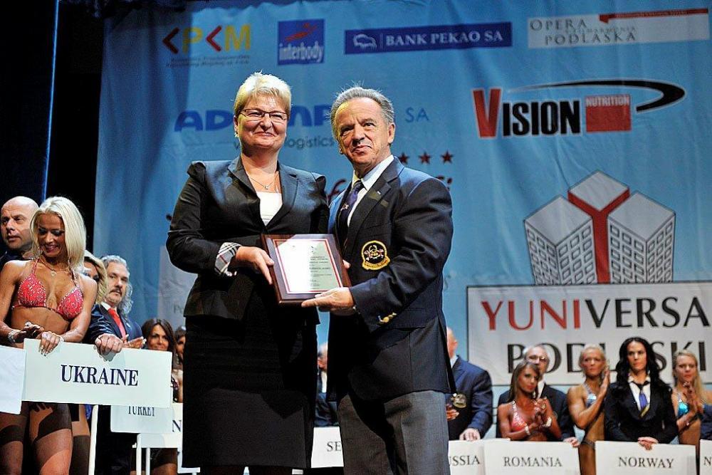 Photo 9: Commemorative Award of the Bialystok city for the IFBB President Dr. Rafael Santonja presented by the Deputy Mayor Prof. Renata Przygodzka.