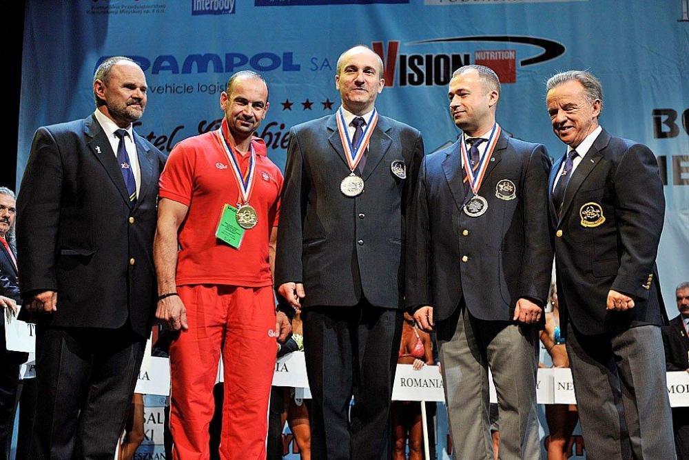Photo 8: IFBB Medals for Polish Federation officials: National Coach Mr. Bogdan Szczotka (second from left), bodybuilding judge and software expert Mr. Jan Lewandowski (in the center) and Polish Federation Judges Committee Secretary Mr. Arkadius Kempinski (second from right) presented by Dr. Santonja (far right) and Mr. Filleborn (far left).